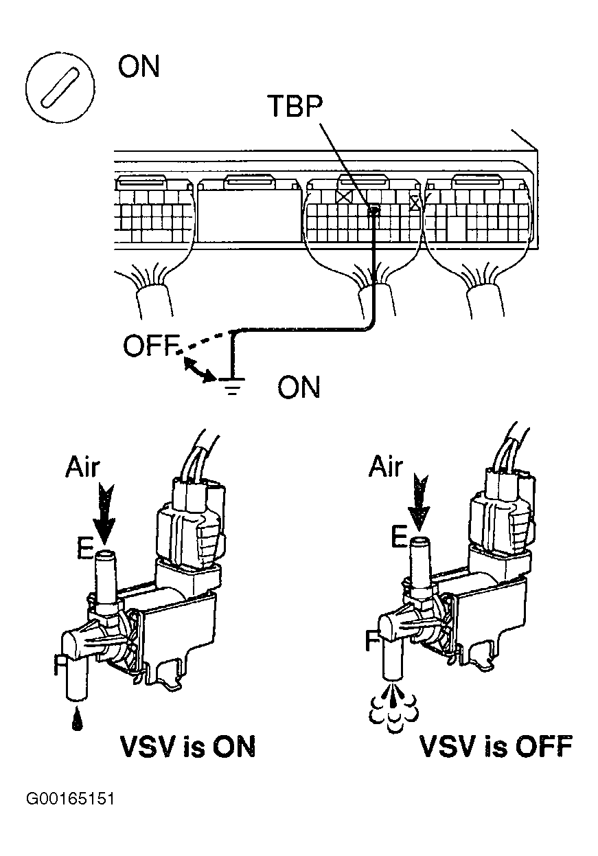 - Remove engine room ECM cover. Turn ignition on. Backprobing connector, connect a fused jumper wire between ground and terminal TBP of the ECM connector and body ground (ON), then disconnect wire between terminal TBP of the ECM connector and body ground (OFF). When VSV is ON, air from port "E" flows out through port "F". When VSV is off, air does not flow from port "E" to port "F". See Fig 5. If VSV functions as specified, go to step 22. If not, go to next step.