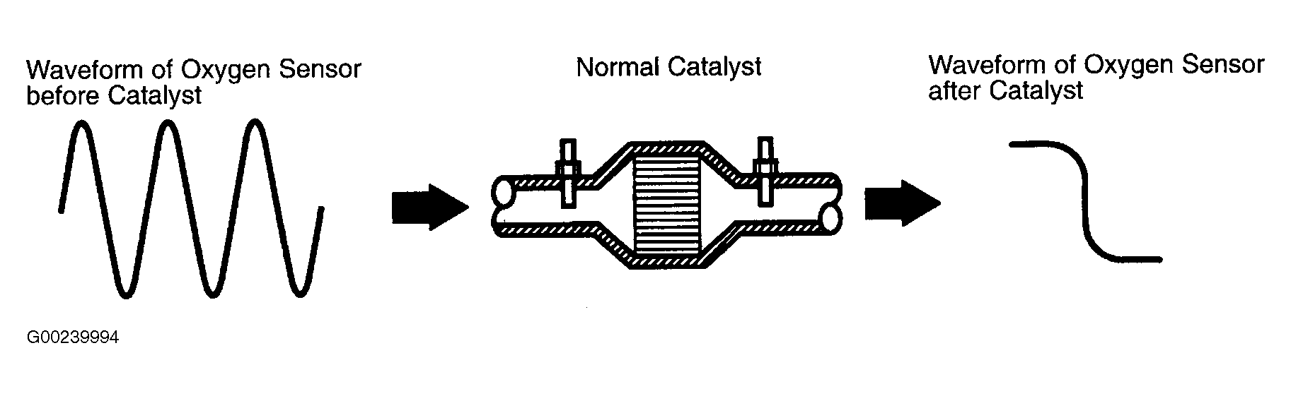 The ECM compares waveform of oxygen sensor located in front of catalytic converter with waveform of oxygen sensor located behind catalytic converter to determine if catalytic converter performance has deteriorated. If catalytic converter is functioning properly, waveform of oxygen sensor after catalytic converter will switch back and forth between rich and lean much more slowly than waveform of oxygen sensor in front of catalytic converter. See Fig 1.