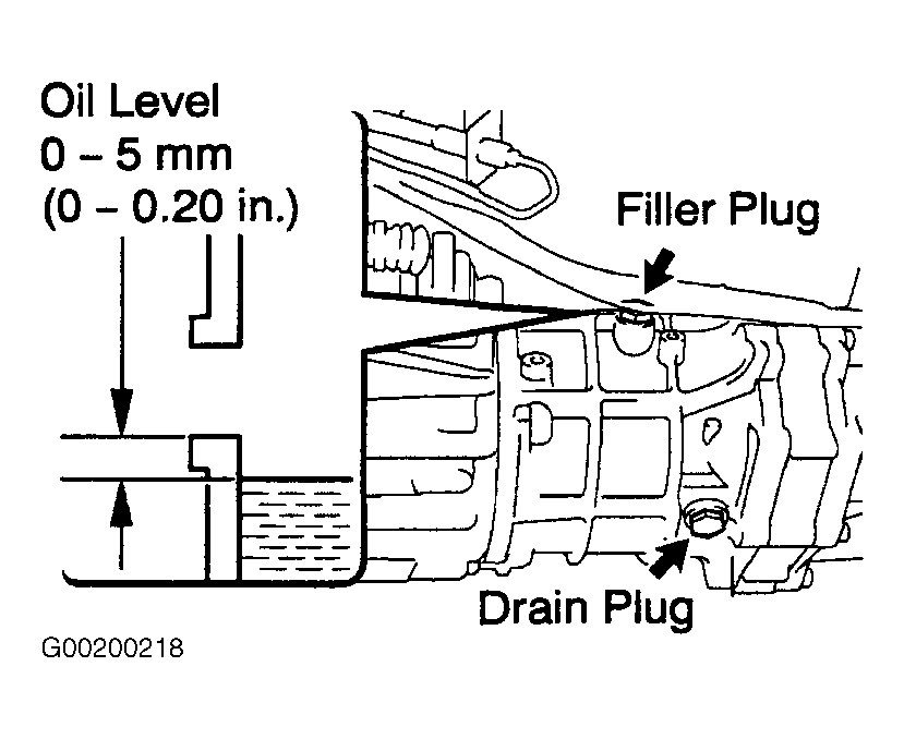 Raise and support the vehicle. Ensure vehicle is level. Remove filler plug from transmission. Fluid should be level with bottom edge of filler plug hole. See Fig 1. If fluid is low, fill with appropriate fluid until fluid is level with filler plug opening. See RECOMMENDED FLUIDS . Reinstall filler plug. Tighten to specification. See TORQUE SPECIFICATIONS .