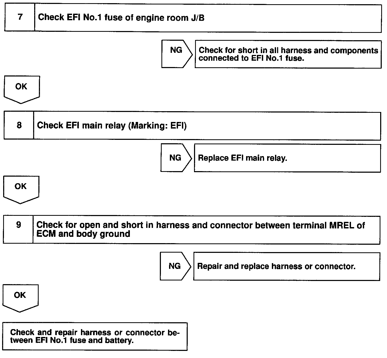 CIRCUIT DESCRIPTIONWhen the ignition switch is turned ON, battery positive voltage is applied to terminal IGSW of the ECM and the EFI main relay (Marking: EFI) control circuit in the ECM sends a signal to terminal MREL of the ECM switching on the EFI main relay.
