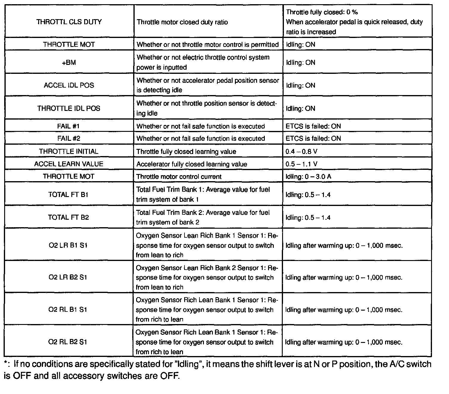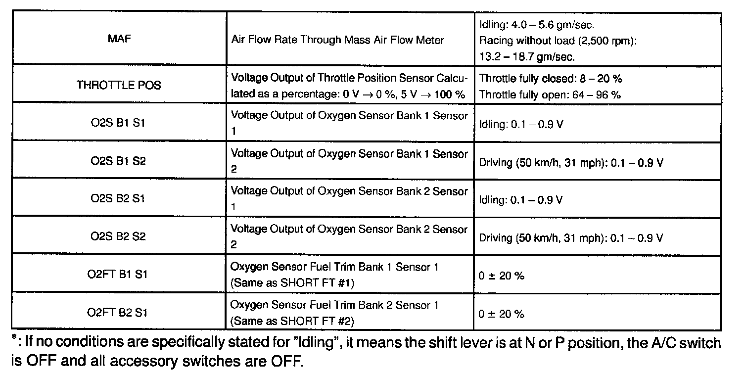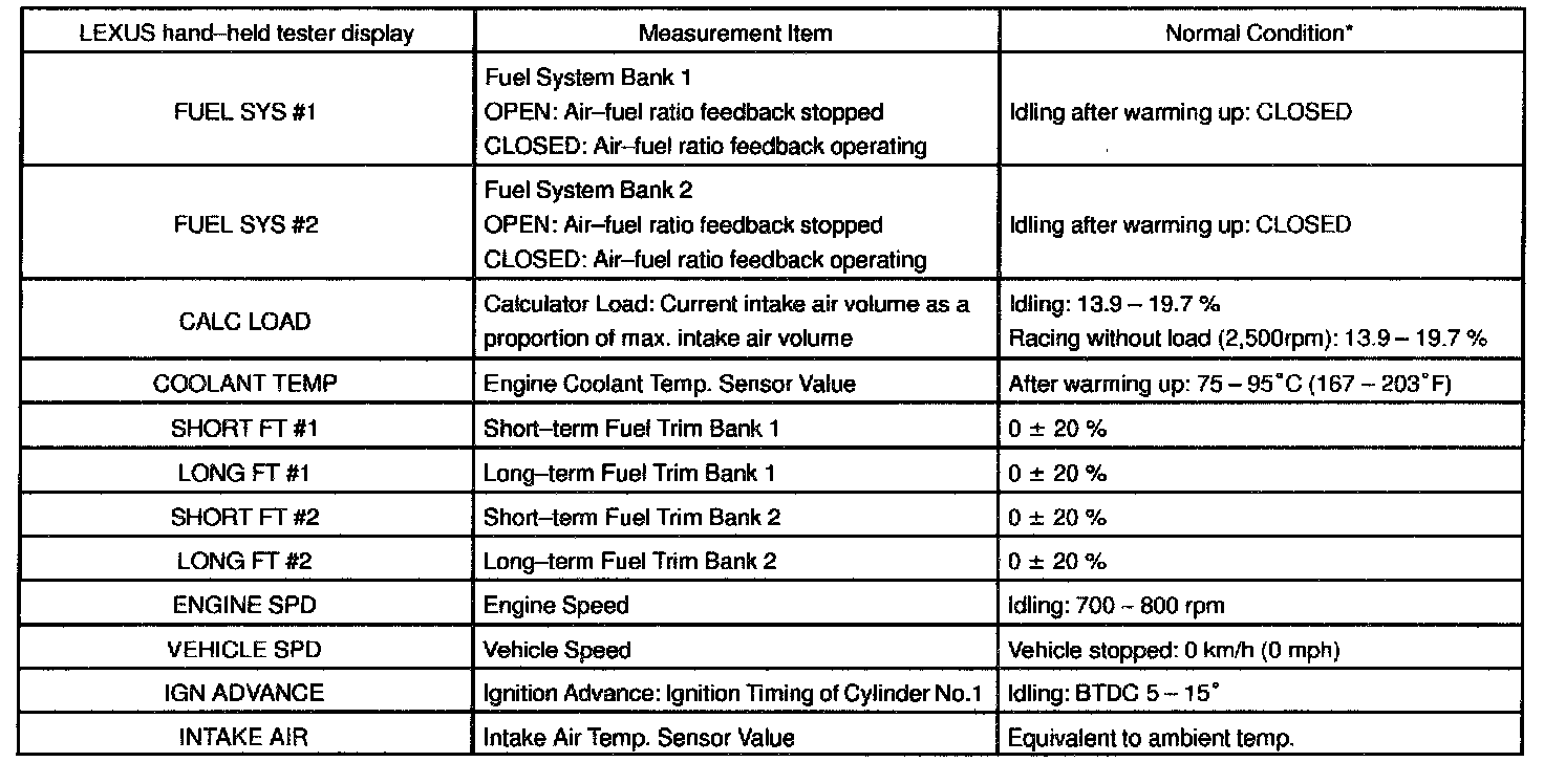 NORMAL ENGINE OPERATING CONDITIONNOTE: The values given for "Normal Condition" are representative values, so a vehicle may still be normal even if its value varies differ from those listed here. So do not decide whether a part is faulty or not solely according to the "Normal Condition" here.