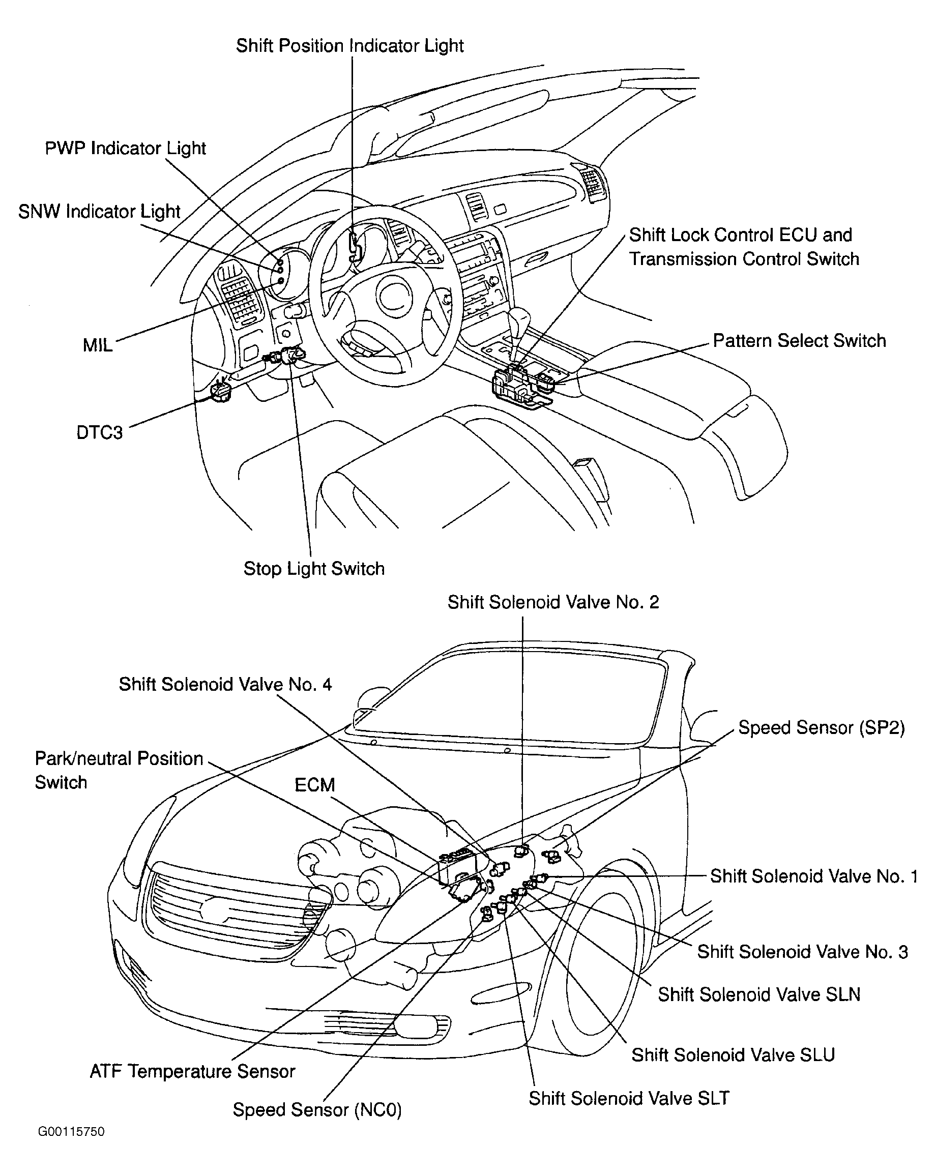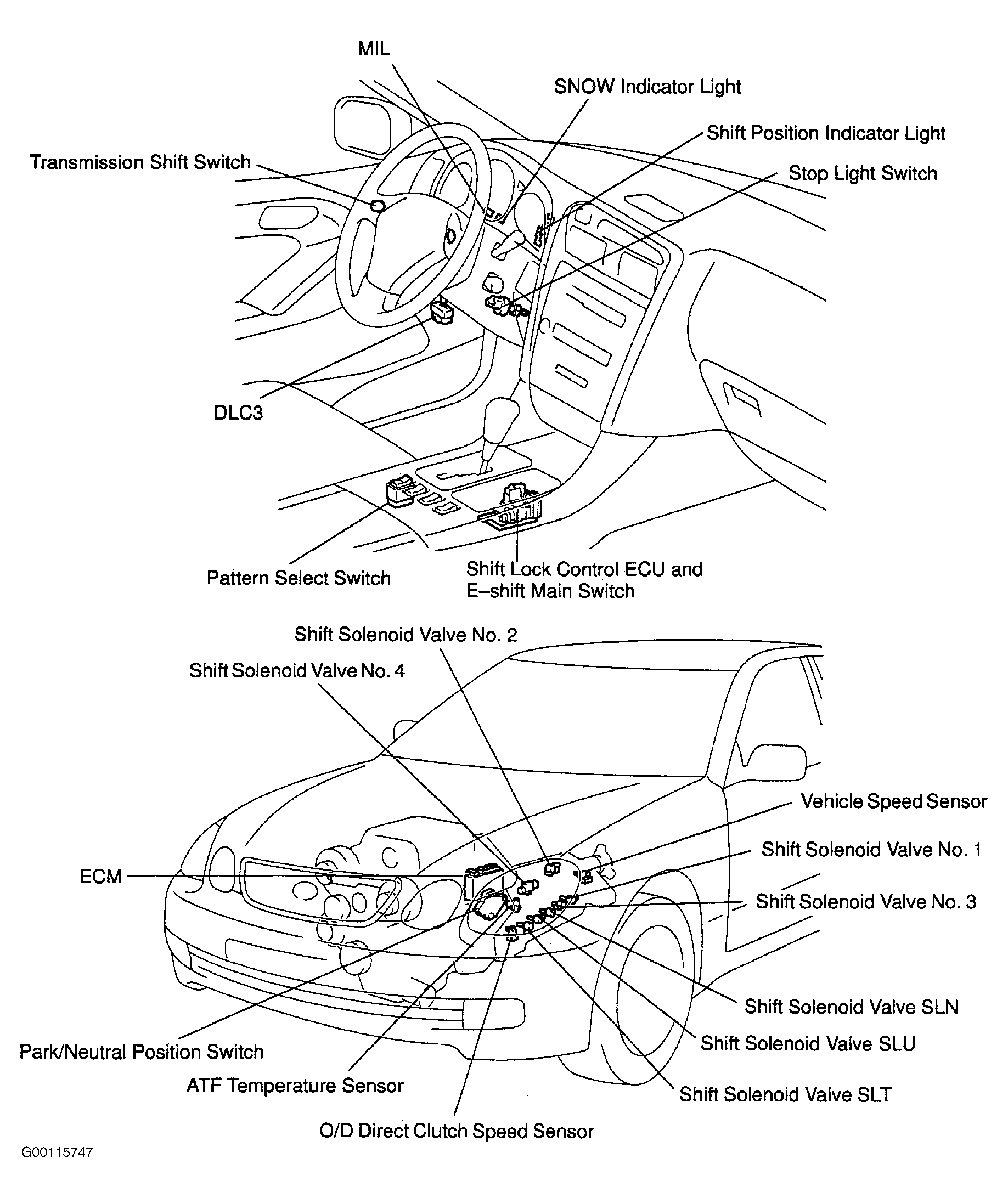 ECM receives information from various input devices and uses this information to control shift solenoids on transmission valve body for transmission shifting and lock-up solenoid (also called SLU solenoid) for torque converter lock-up. ECM contains a self-diagnostic system, which will store Diagnostic Trouble Codes (DTC) if a failure or problem exists in electronic control system. Trouble codes can be retrieved to determine problem area. See SELF DIAGNOSTIC SYSTEM . For ECM locations, see Figure-Figure .