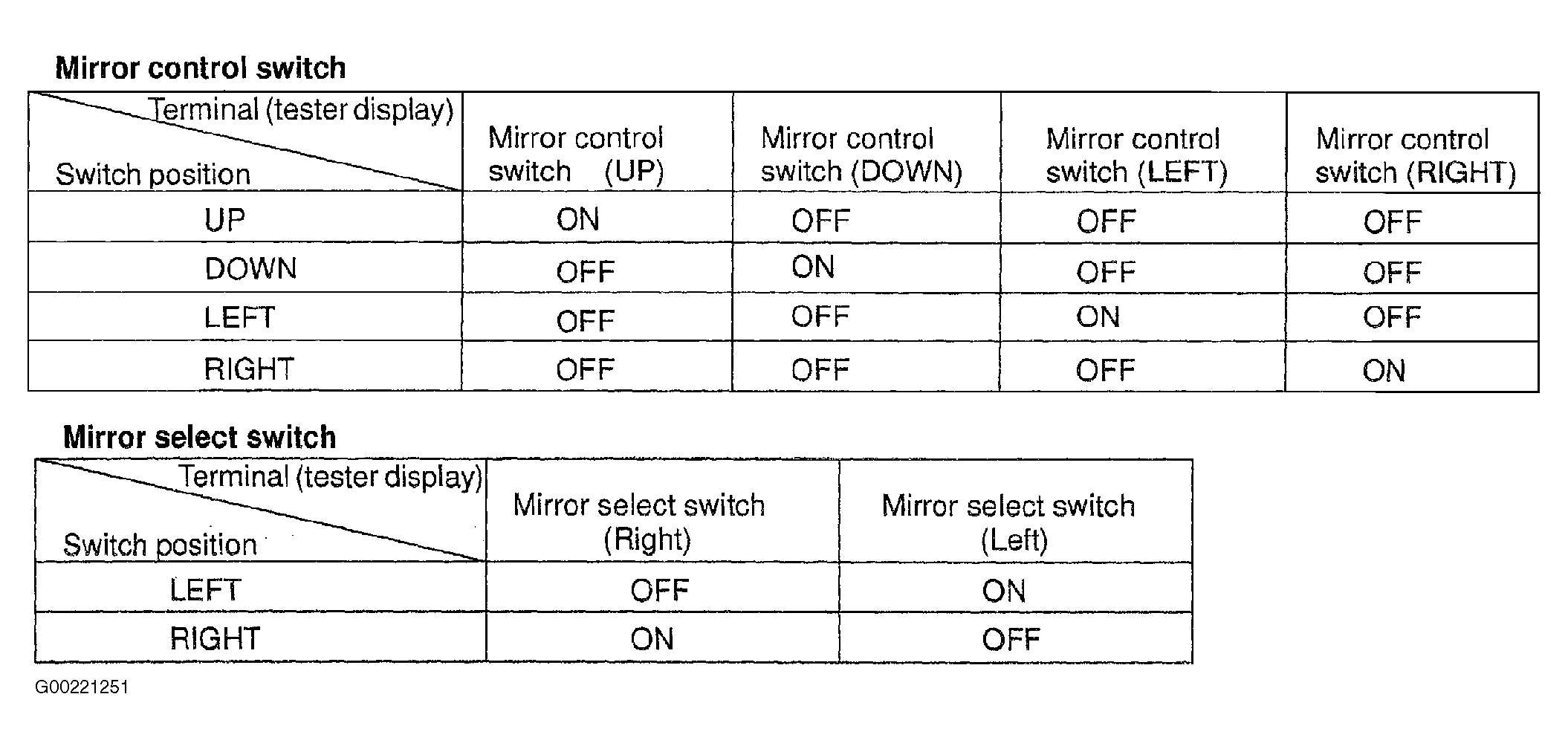 - Check the mirror switch. See appropriate POWER & ELECTRO CHROMIC MIRRORS article. If the results are OK, go to the next step. If the results are not good, replace the mirror switch. See appropriate INSTRUMENT PANEL article.