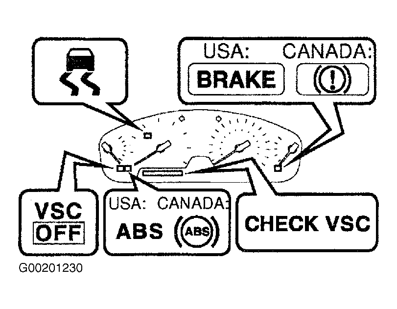 NOTE: If the ECU stores DTC, "CHECK VSC" is displayed on the multi-information display and ABS warning light and VSC OFF indicator light are ON. See Fig 1.