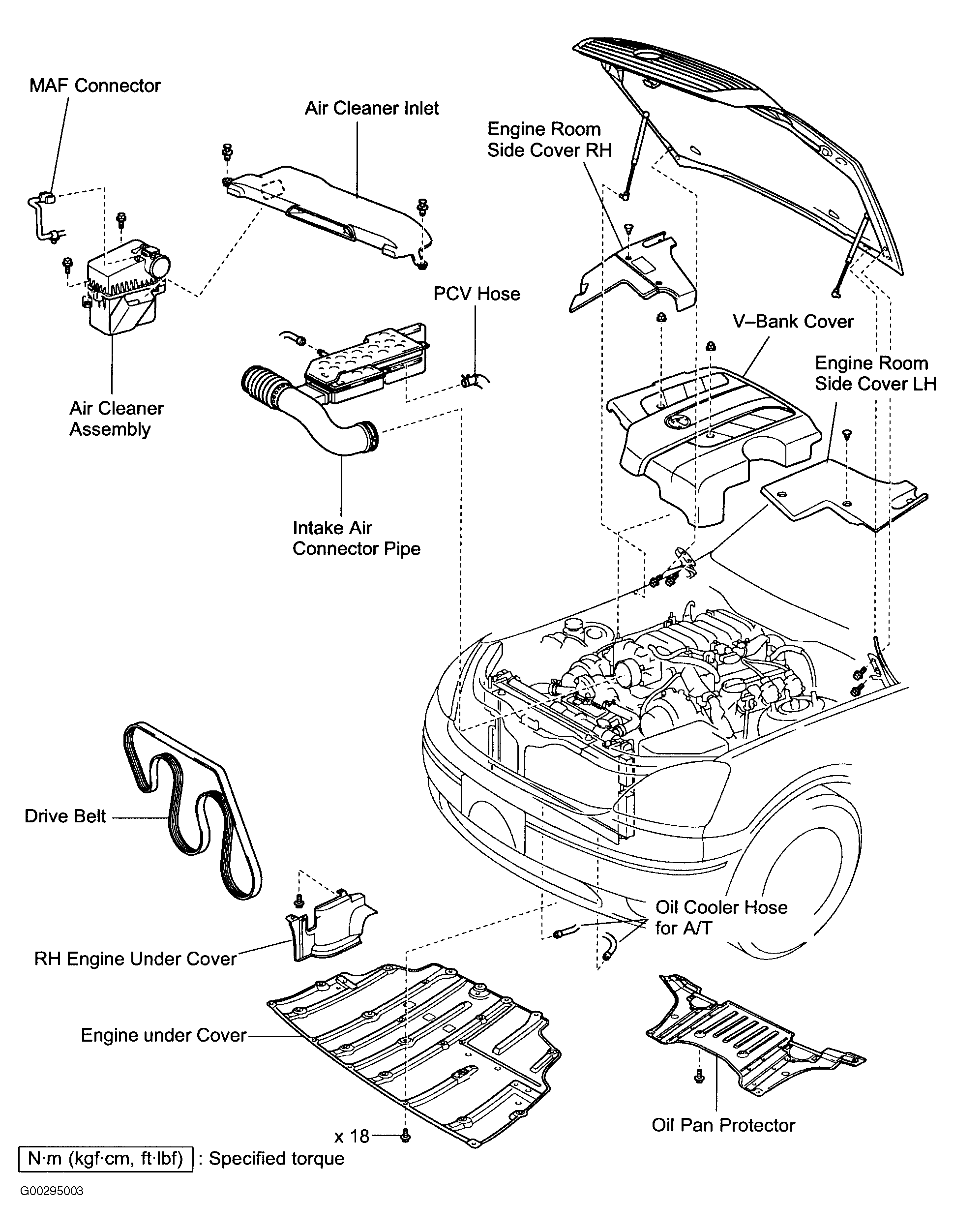 - Release fuel pressure. See FUEL PRESSURE RELEASE . Remove hood. Remove engine "V" bank and side covers. Remove battery cover and battery. Remove air cleaner assembly and intake air duct. Raise and support vehicle. Remove engine under covers. Disconnect ATF cooler lines from radiator. Drain cooling system and engine oil. Lower vehicle.