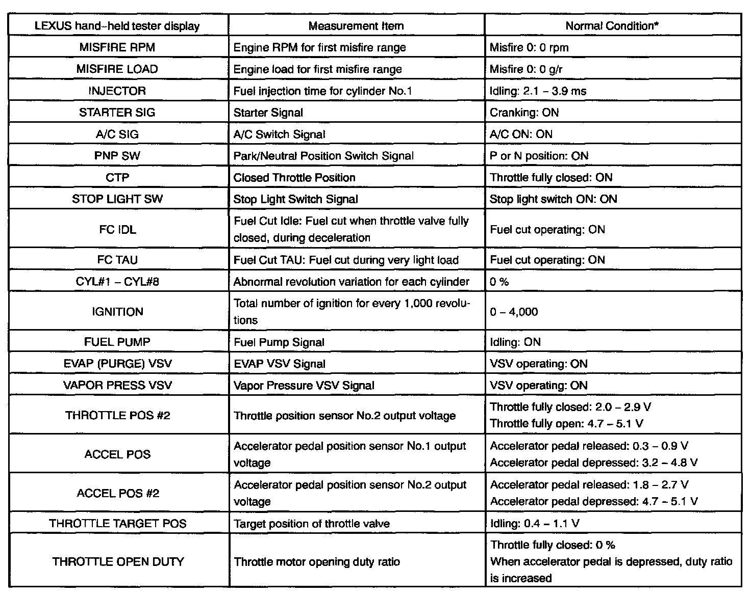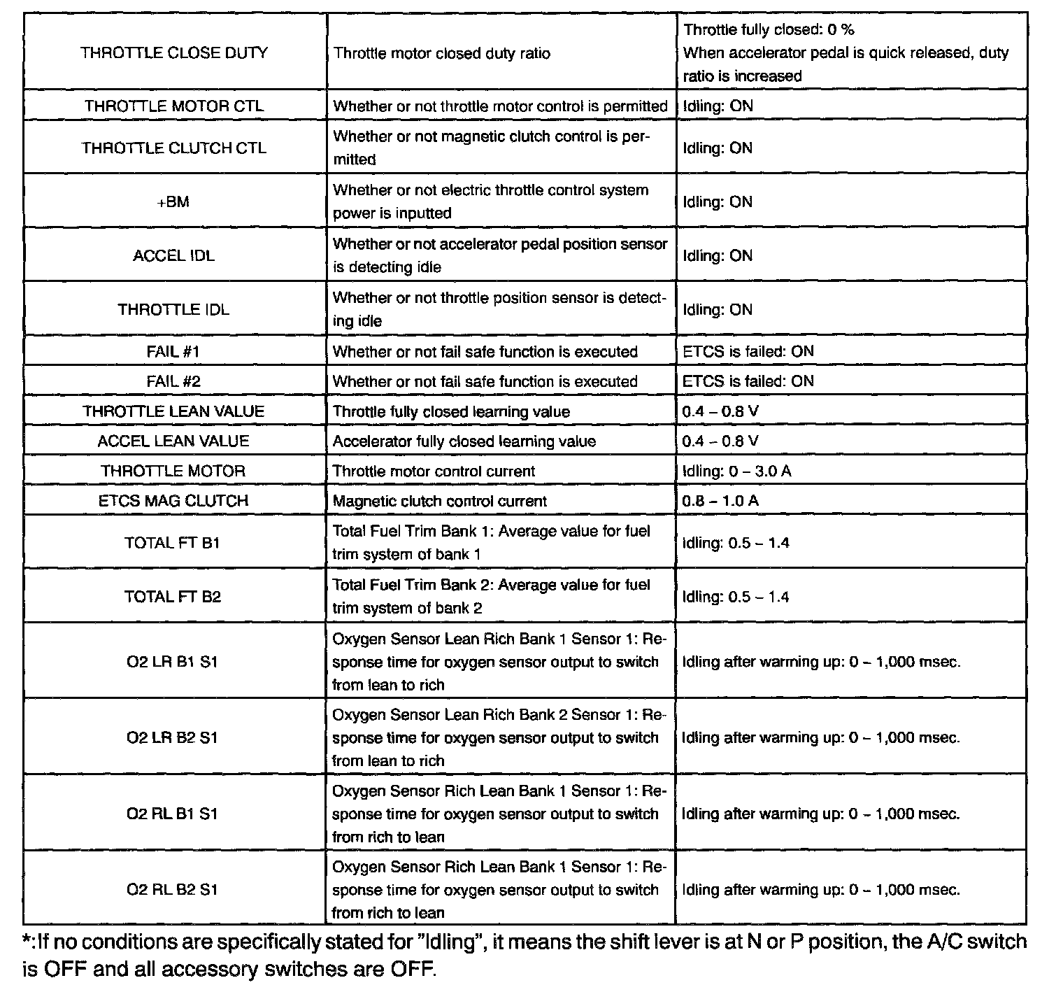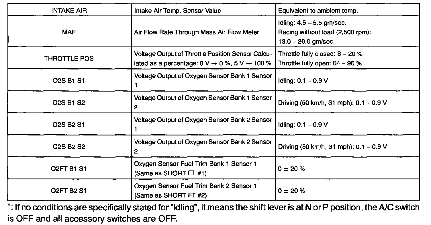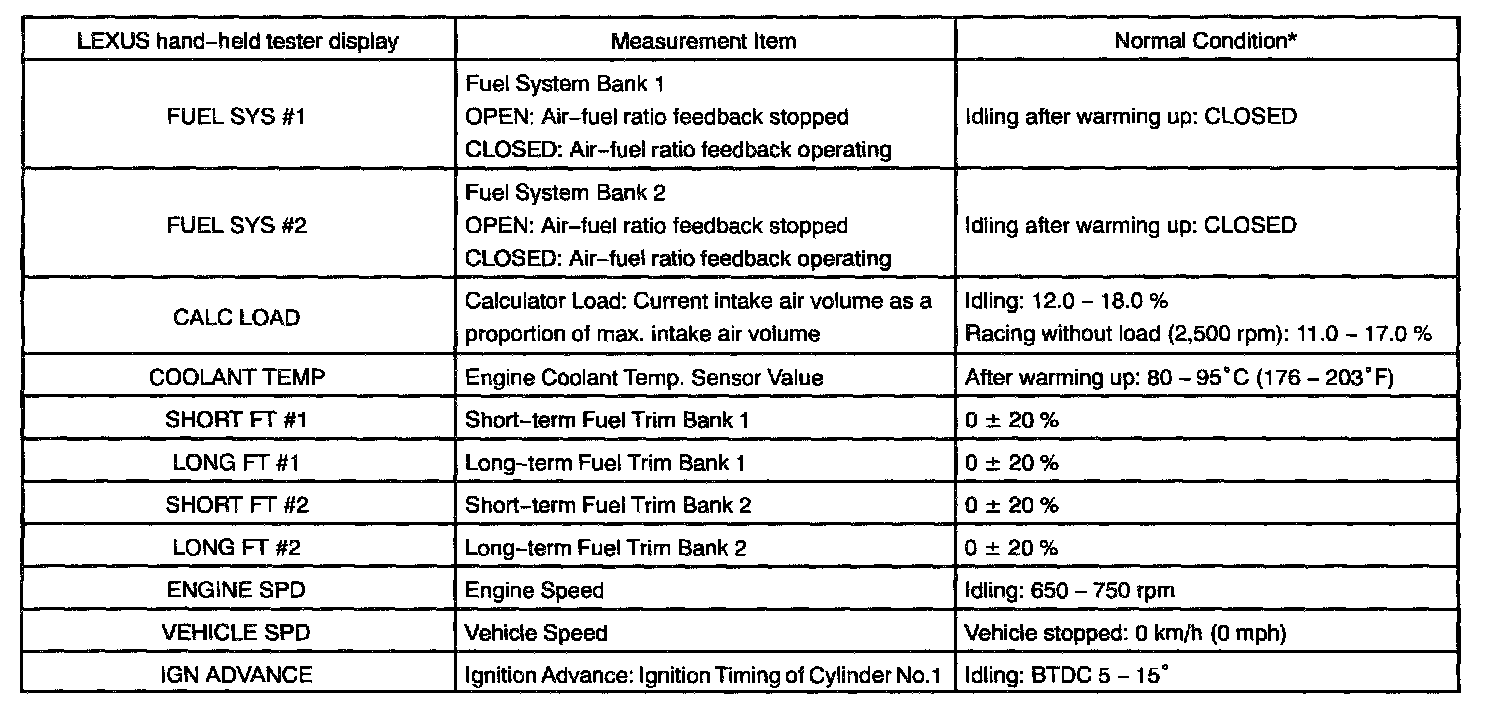 ENGINE OPERATING CONDITIONNOTE: The values given for "Normal Condition" are representative values, so a vehicle may still be normal even if its value varies differ from those listed here. So do not decide whether a part is faulty or not solely according to the "Normal Condition" here.