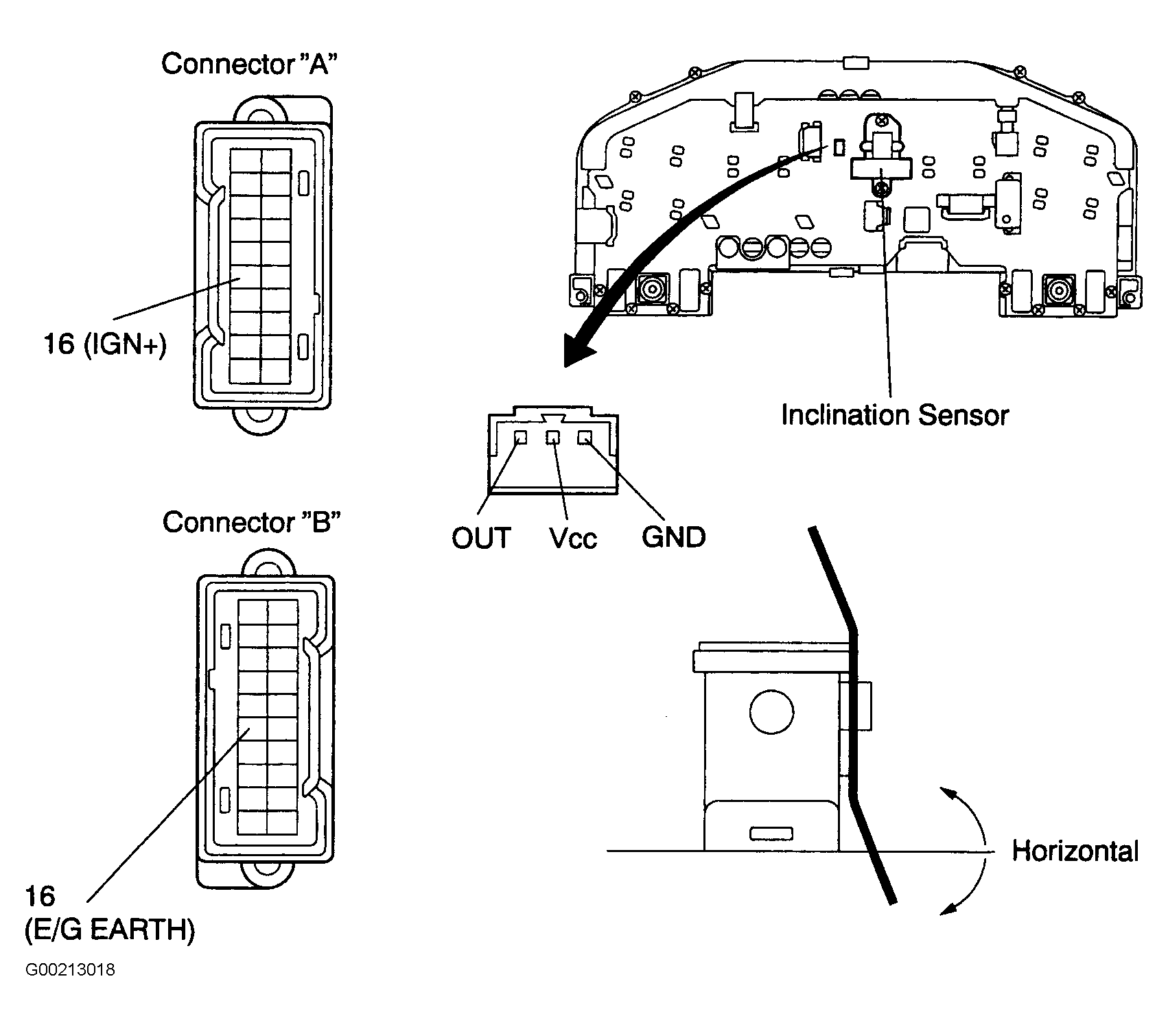 - With the combination meter in which the inclination sensor installed, connect battery positive (+) to terminal No. A16 (IGN+) of the meter connector, and battery negative (-) to terminal No. B16 (E/G EARTH). See Fig 1.