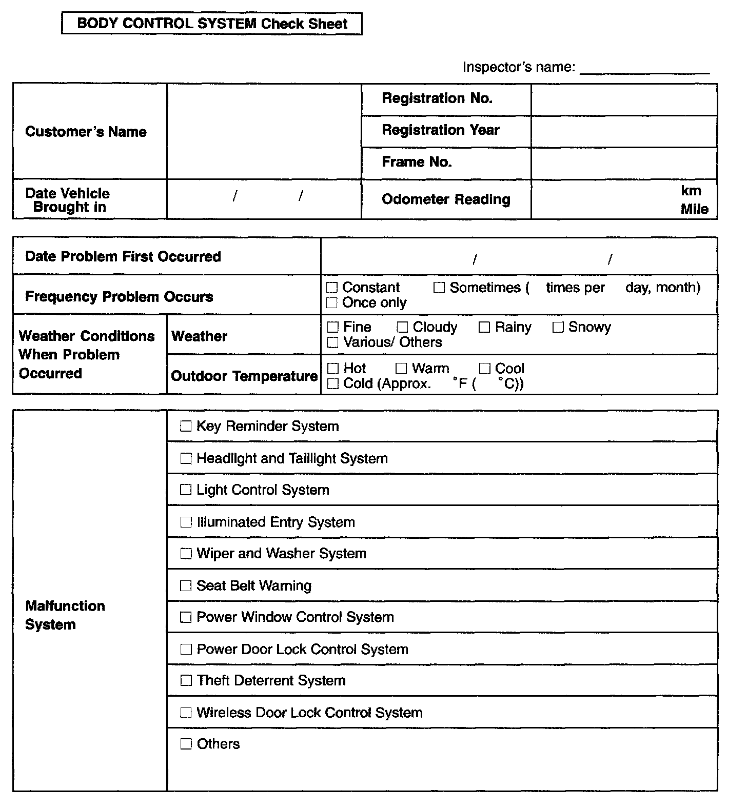 Body Control System Check Sheet: