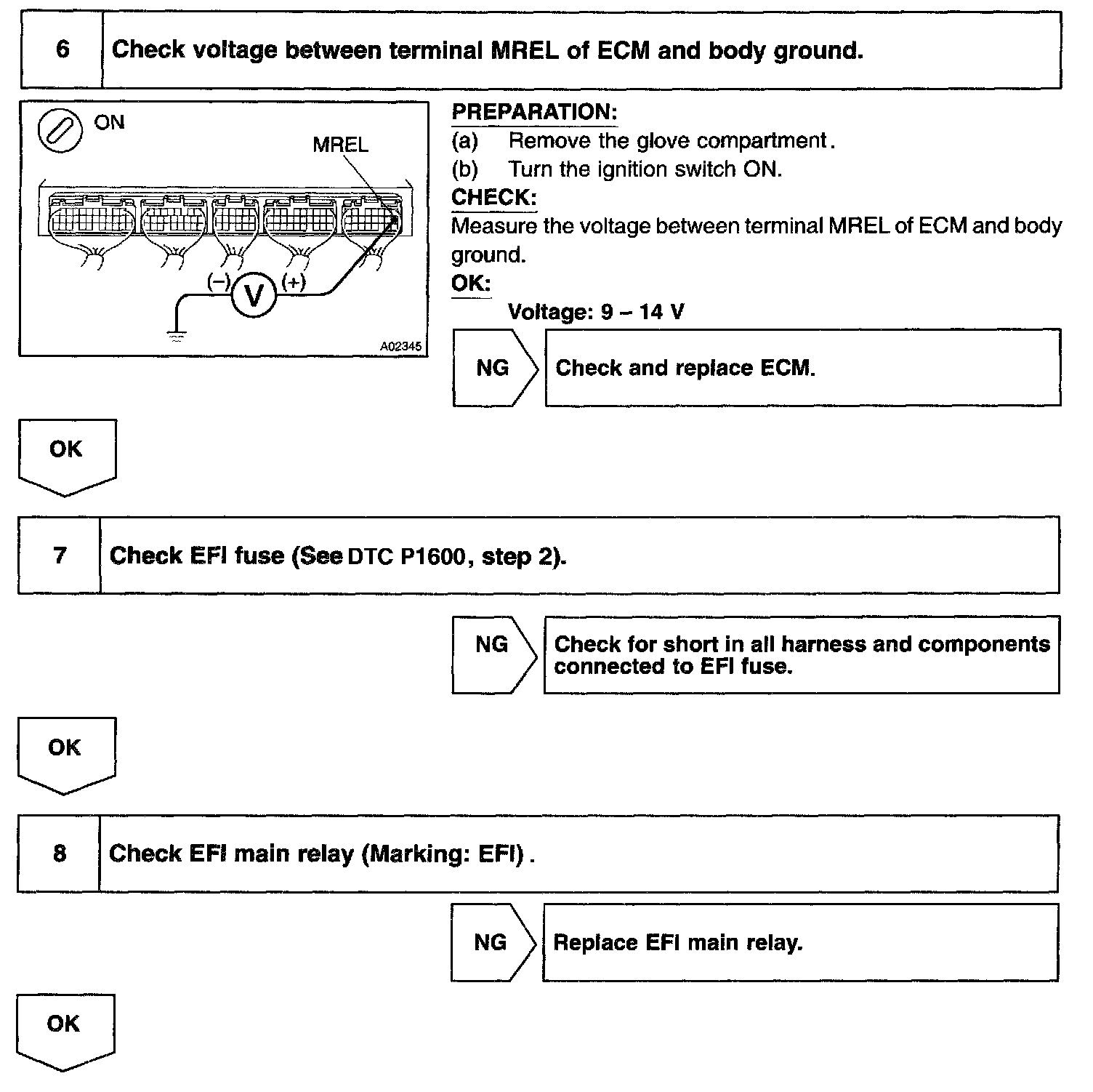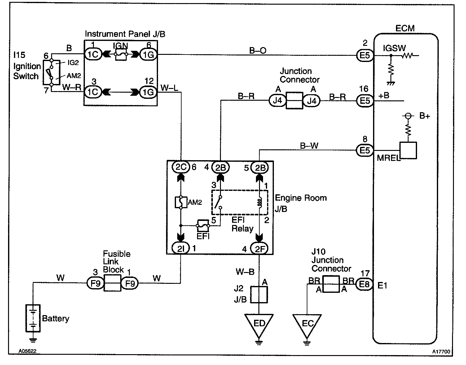 This signal causes current to flow to the coil, closing the contacts of the EFI main relay and supplying power to terminal +B of the ECM.