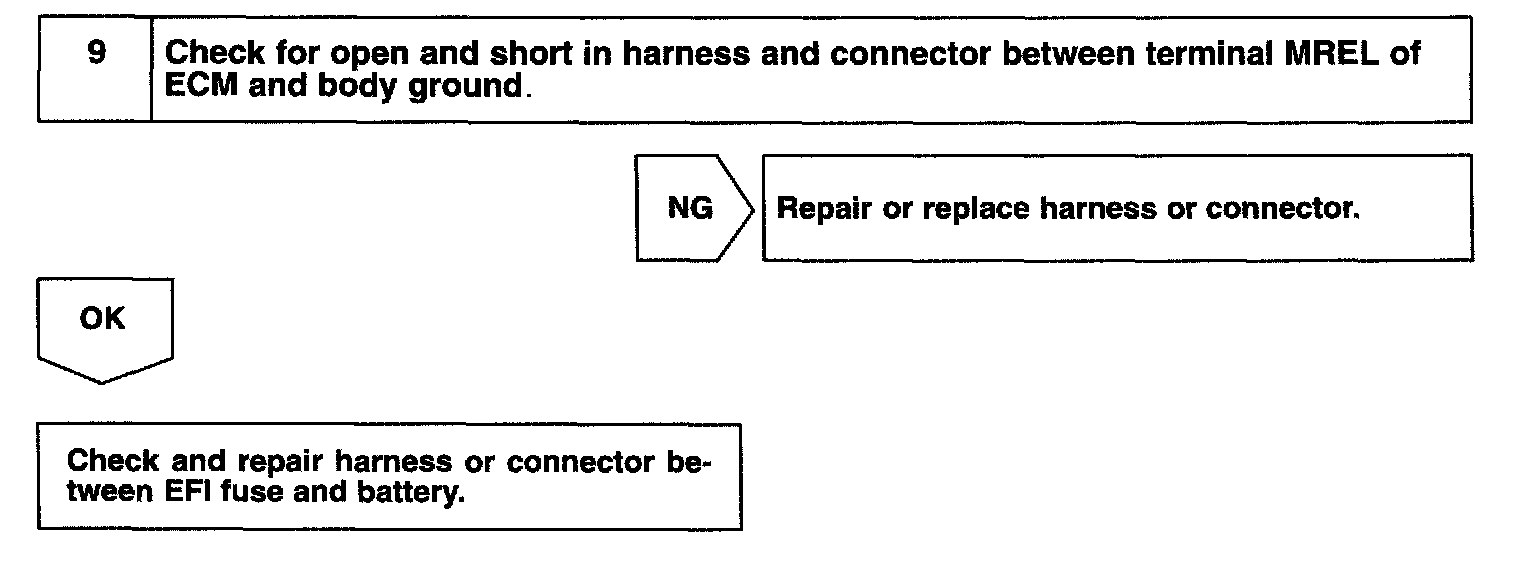 CIRCUIT DESCRIPTIONWhen the ignition switch is turned ON, battery positive voltage is applied to terminal IGSW of the ECM and the EFI main relay (Marking: EFI) control circuit in the ECM sends a signal to terminal MREL of the ECM switching on the EFI main relay.