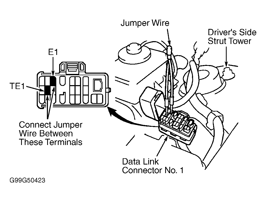 4. Install Jumper Wire (SST 09843-18020) between terminals TE1 and E1 on DLC1. See Fig 2. DLC1 is located on end of air intake chamber at passenger's side of engine compartment.