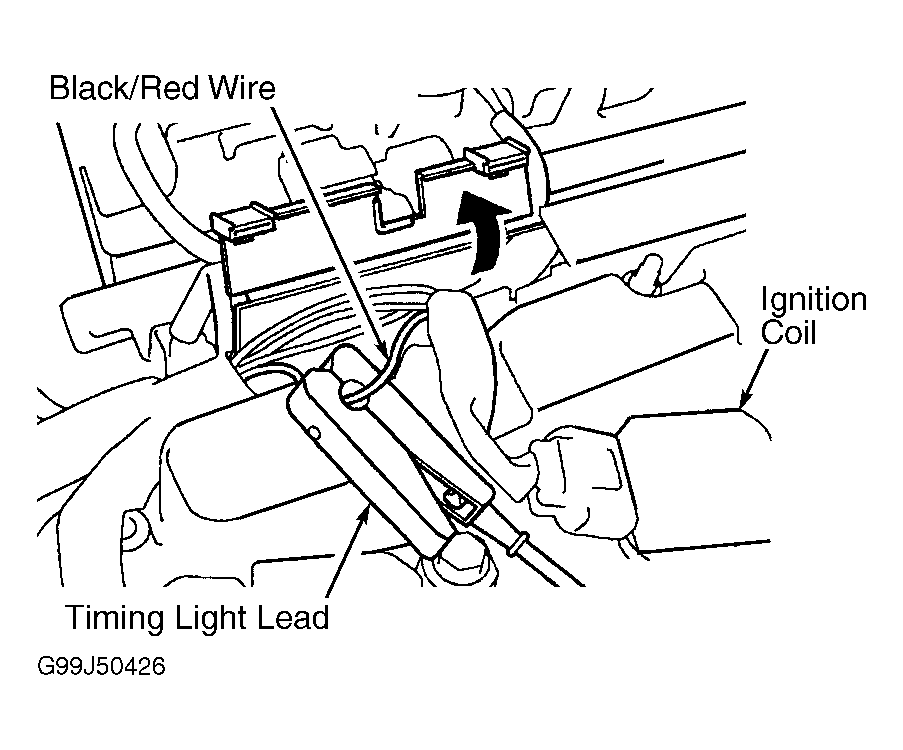 2. Connect timing light lead to Black/Red wire at ignition coil electrical connector on top of front valve cover at cylinder No. 4. See Fig 1. Open wiring harness cover to gain access if necessary. Cylinder No. 4 is second cylinder on left side when viewed from flywheel end of engine. See Figure.