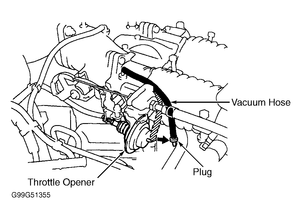 Start engine and warm engine to normal operating temperature. Ensure idle speed is 650-750 RPM. Disconnect and plug vacuum hose at throttle opener near throttle body. See Fig 1. Note engine speed. Engine speed should be 1100-1700 RPM. If engine speed is not 1100-1700 RPM, replace throttle body. See THROTTLE BODY under FUEL SYSTEM in REMOVAL, OVERHAUL & INSTALLATION article.