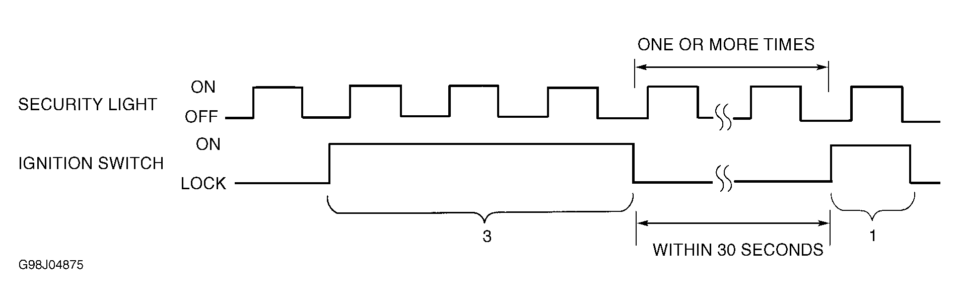 3. Turn ignition switch to ON position for length of time required for SECURITY light to flash the same number of times that coincides with first code word digit. Turn ignition switch to LOCK position for at least one flash, but for less than 30 seconds. Repeat procedure for each code word digit. When code word is registered correctly, SECURITY light will stop flashing and stay illuminated. Continue immobilizer system reprogram procedure.