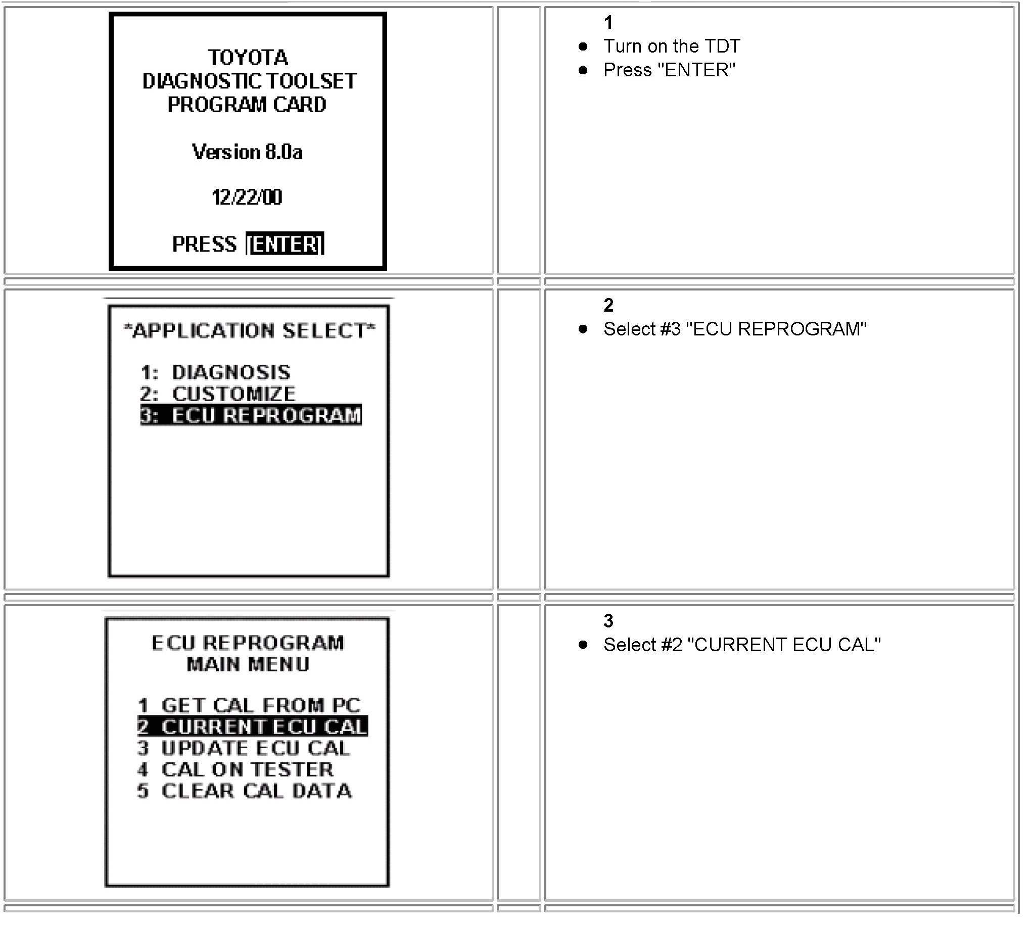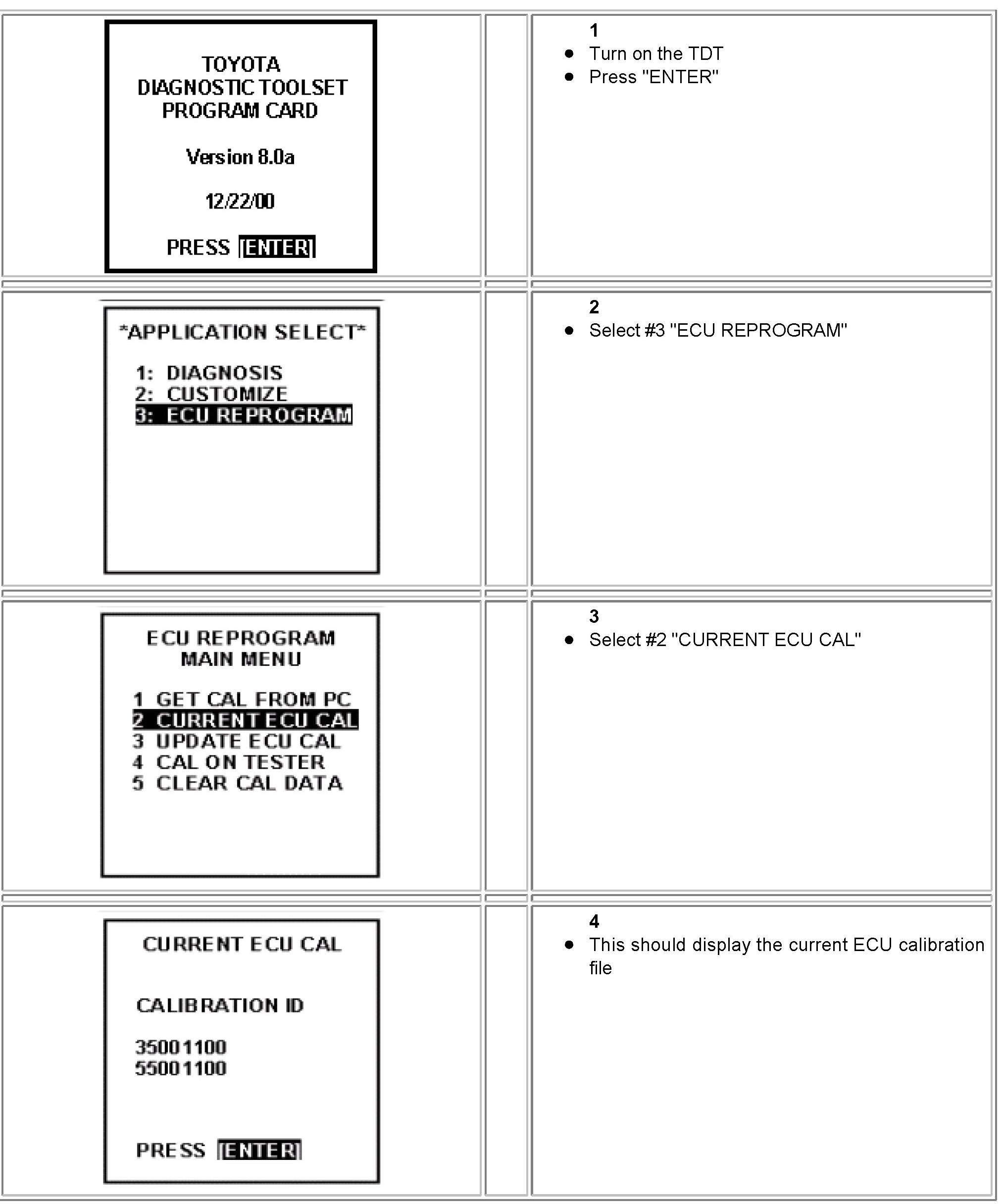 A. Connect the Diagnostic Tester to the vehicle and select CURRENT ECU CAL from the ECU REPROGRAM MAIN MENU. Determine the vehicle's current ECU calibration.