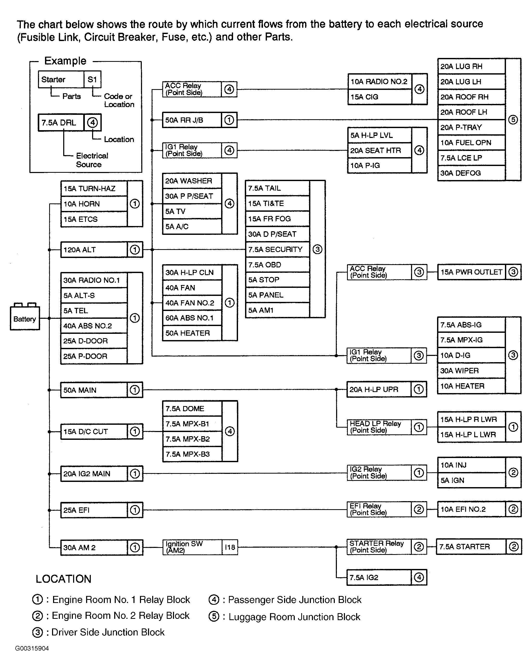For identification and locations of junction and relay blocks in engine compartment, see