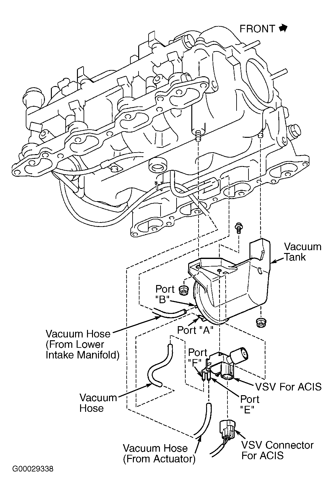 Disconnect vacuum hoses from vacuum tank. Vacuum tank is located under front of intake manifold. Apply compressed air to port "A". See Fig 1. Air should flow out of port "B". Apply compressed air to port "B". Air should not flow out of port "A". Plug port "B". Apply 11.8 in. Hg of vacuum to port "A". Vacuum should hold for at least one minute. If ACIS vacuum tank does not operate as specified, replace ACIS vacuum tank. If ACIS vacuum tank operates as specified, check vacuum switching valve. See ACIS VACUUM SWITCHING VALVE .