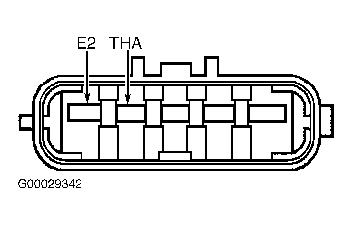 IAT sensor is part of Mass Airflow (MAF) sensor. Turn ignition off. Disconnect MAF sensor connector. Measure resistance between MAF sensor terminals THA and E2. See Fig 1. Replace MAF sensor if resistance is not as specified. See INTAKE AIR TEMPERATURE (IAT) SENSOR RESISTANCE table.