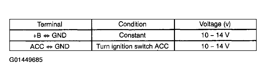 - Measure voltage between terminals +B, ACC and GND of navigation ECU under each condition, as shown in Fig 2.