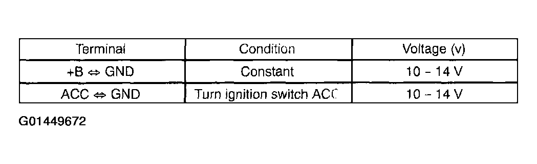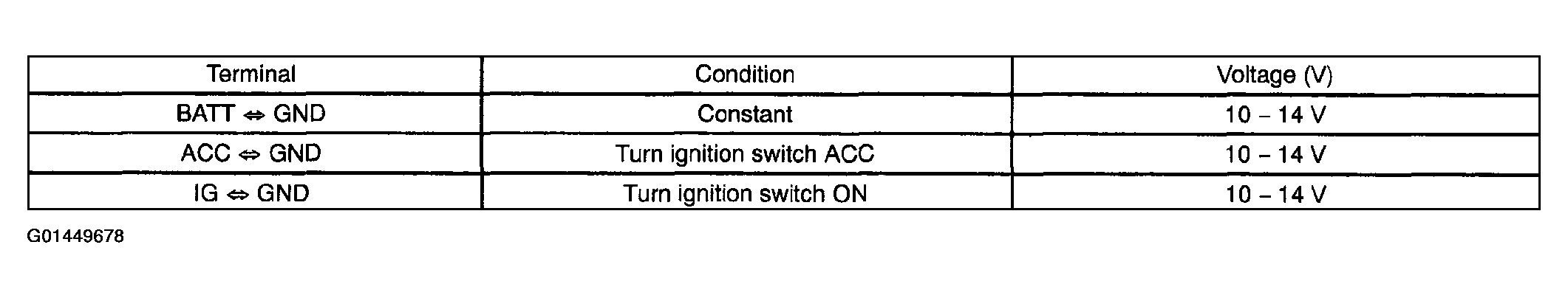 - Measure voltage between terminals +B, ACC and GND of navigation ECU under each condition, as shown in Fig 3.
