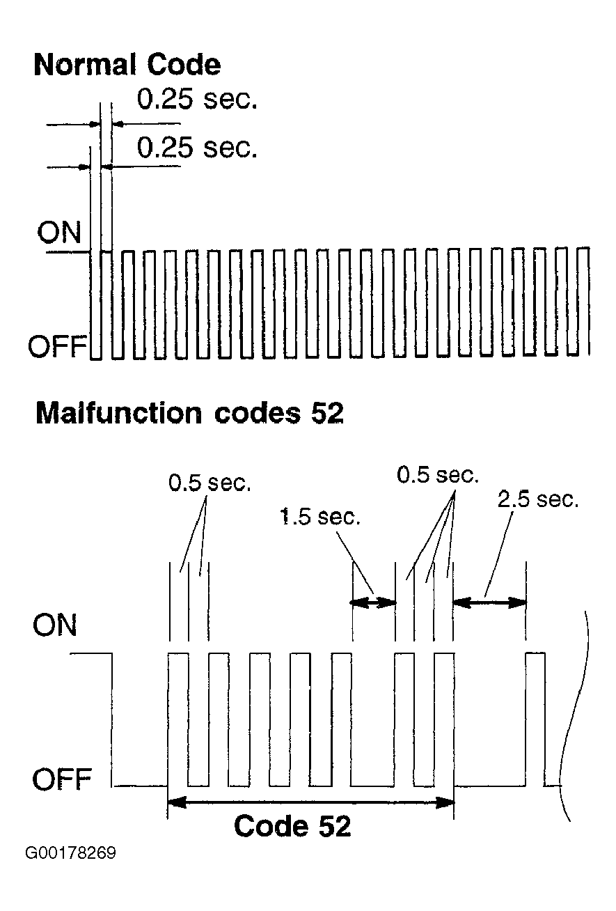 - If the DTC is not output, inspect the diagnosis circuit. As an example, the blinking patterns for codes; normal 52 are shown in illustration. See Fig 4.