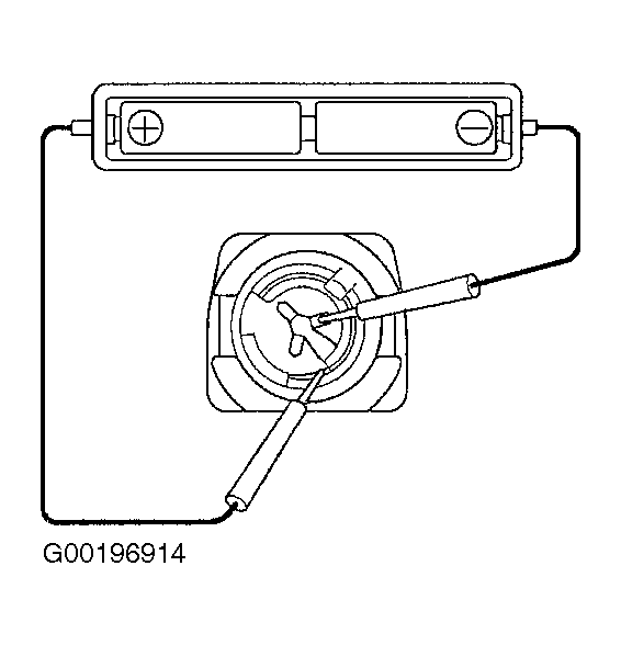 1. Remove the wireless door lock control transmitter battery. See WIRELESS DOOR LOCK CONTROL TRANSMITTER BATTERY  under REMOVAL & INSTALLATION. When a new or normal battery cannot be obtained, connect 2 new 1.5 volt batteries in series. Then apply 3 volts to the transmitter by connecting the battery (+) to the battery receptacle side terminal and battery (-) to the bottom terminal. See Fig 1.