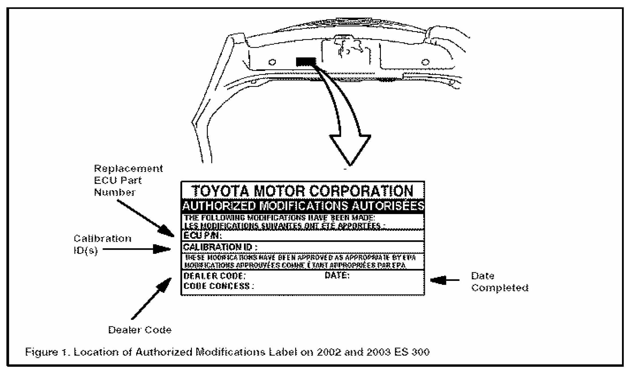 1. Check for the Authorized Modifications Label affixed to the vehicle in the location shown in Figure 1. Confirm if ECM (PCM) calibration has been updated. If not latest ECM (PCM) calibration - go to step 2.