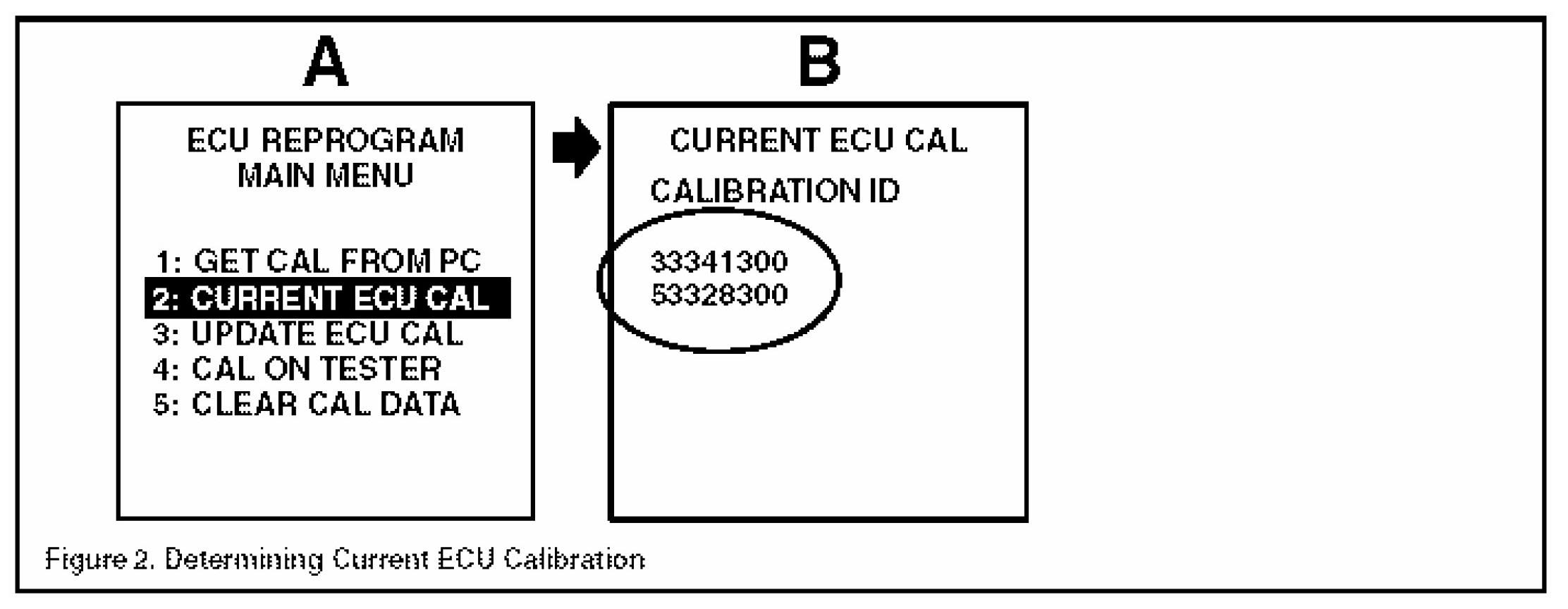 2. Connect the Diagnostic Tester to the vehicle and select CURRENT ECU CAL from the ECU REPROGRAM MAIN MENU. Determine the vehicle's current ECU calibration (see Figure 2).