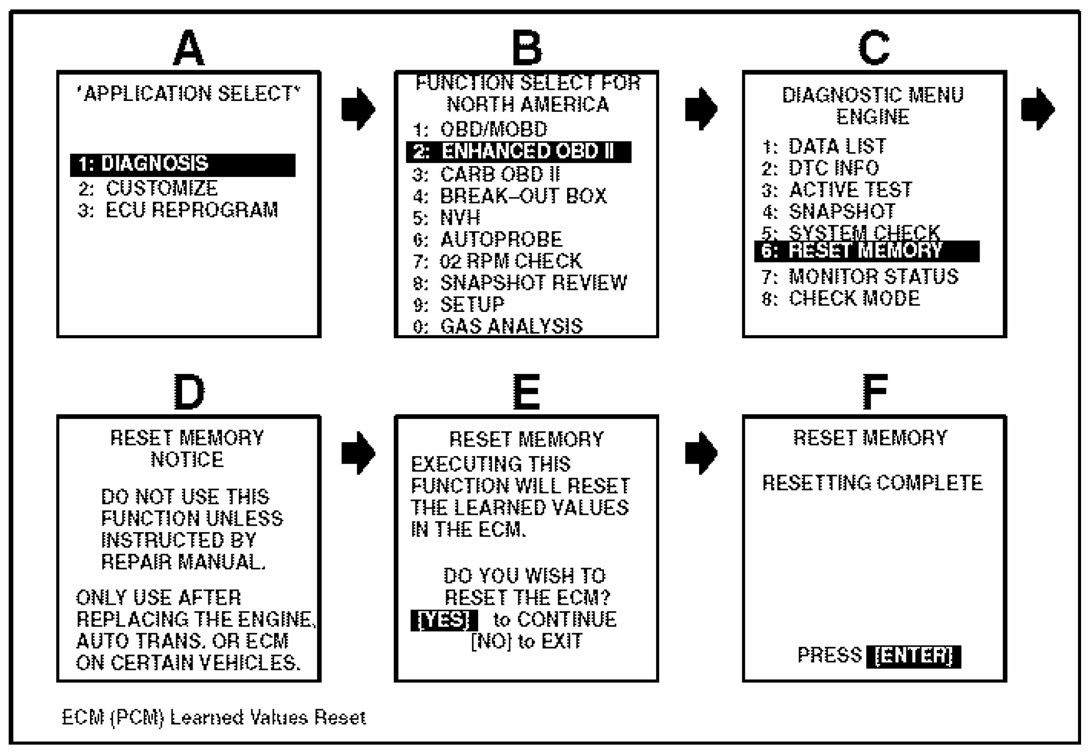 5. Reset the ECM learned values using the diagnostic tester. Refer to the procedures below.