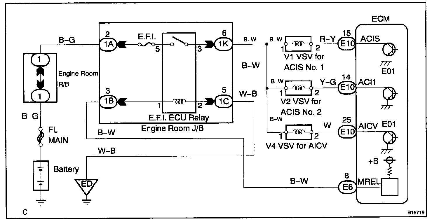 CIRCUIT DESCRIPTIONThis circuit opens and closes the Intake Air Control Valve in response to the engine load in order to increase the intake efficiency (ACIS: Acoustic Control Induction System).