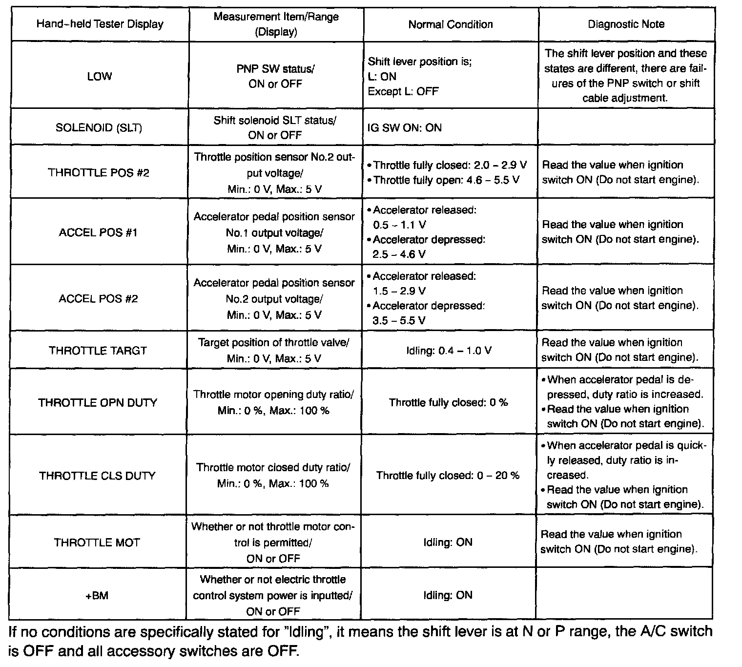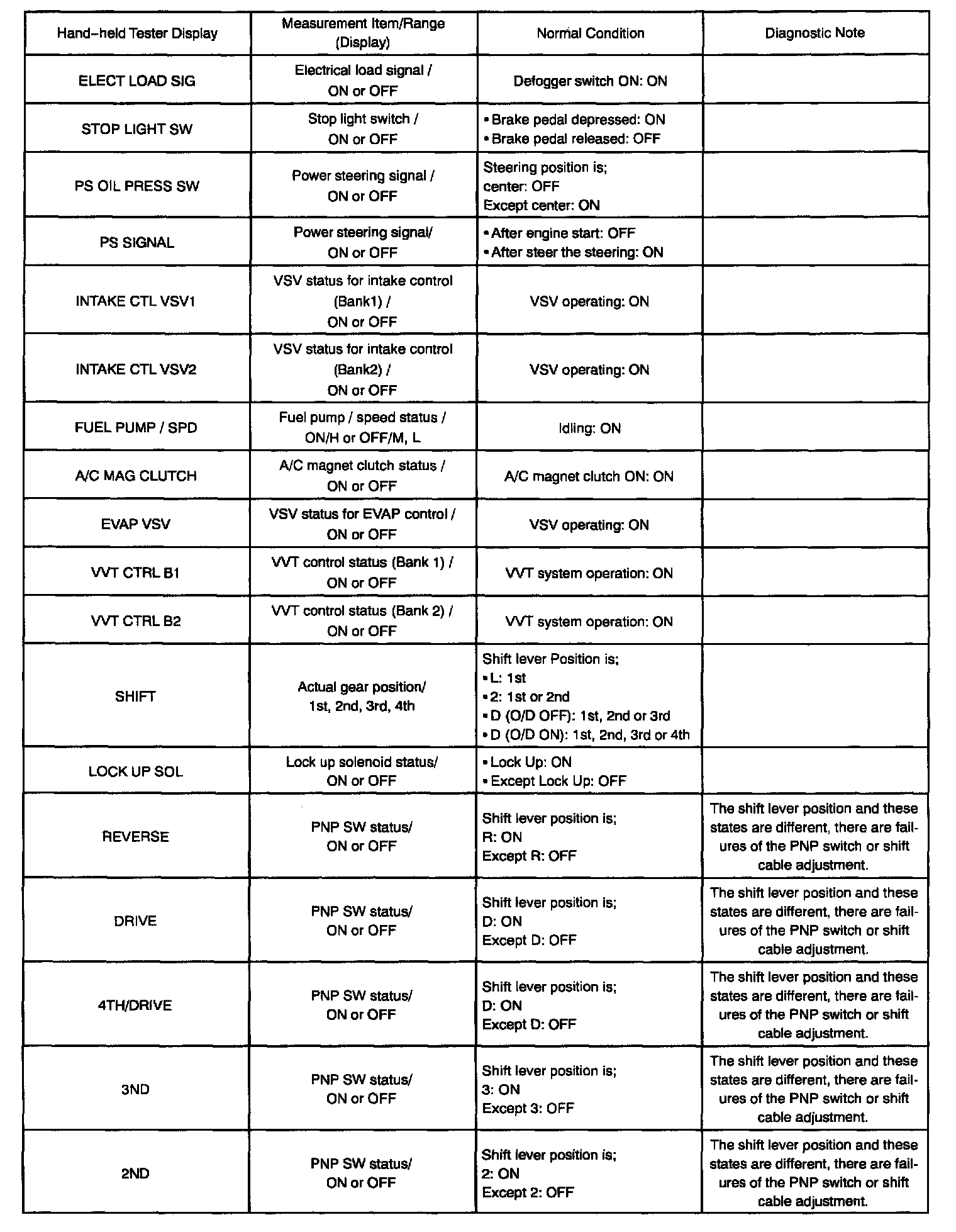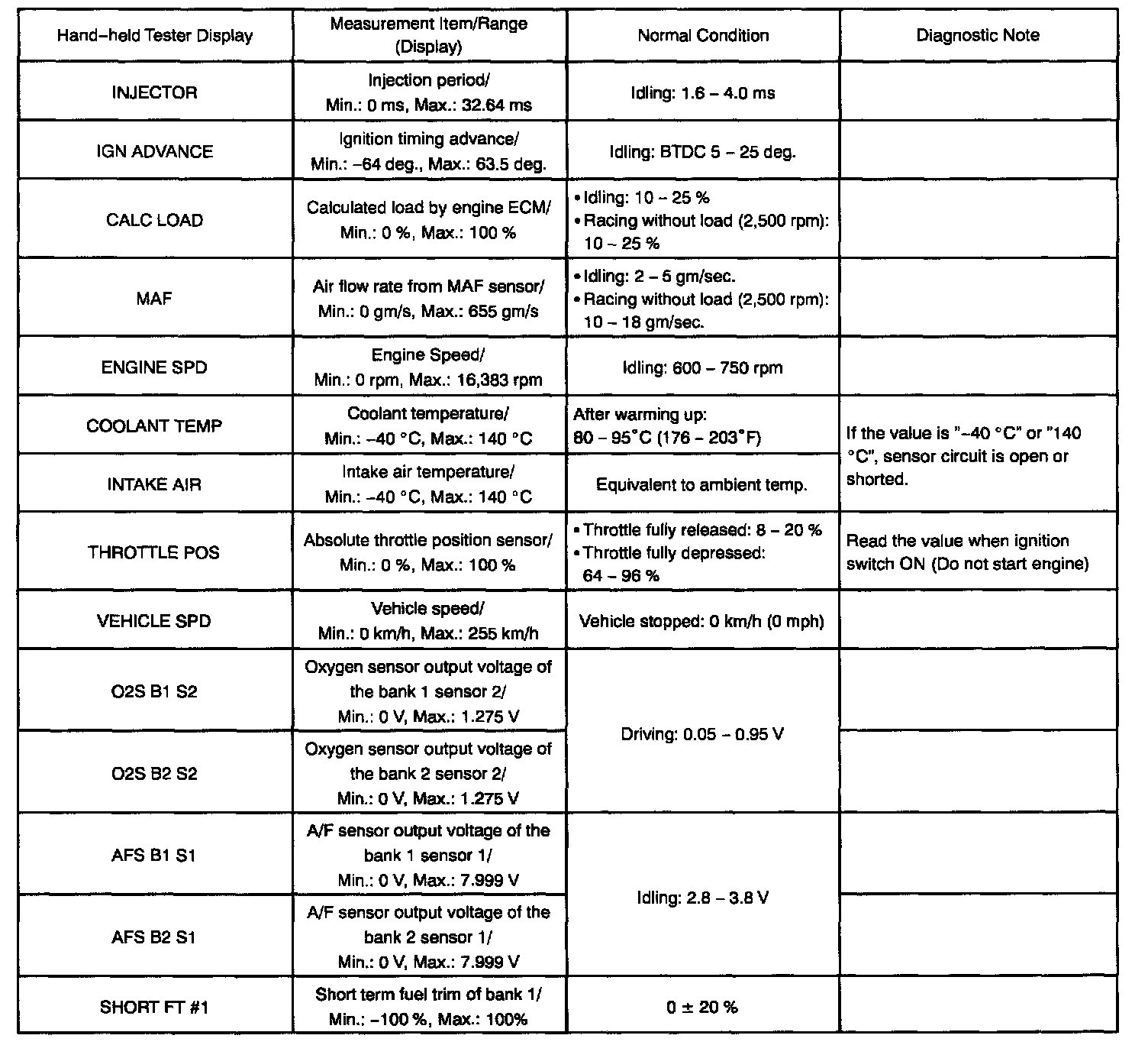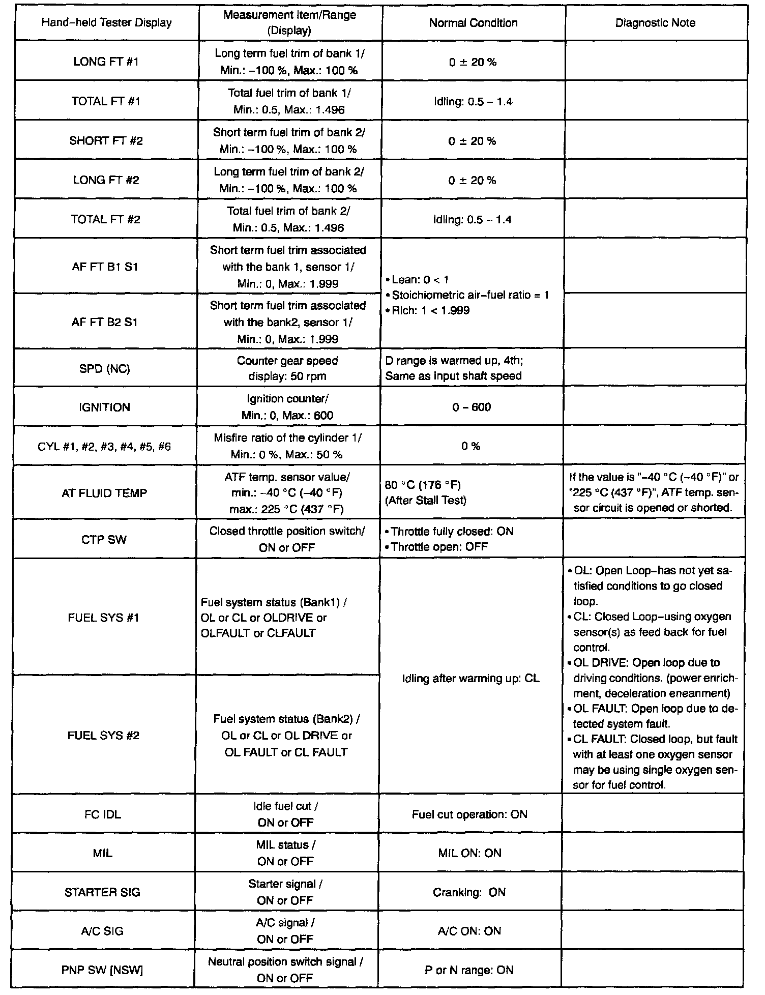 DATA LISTHINT: According to the DATA LIST displayed by the OBD II scan tool or hand-held tester, you can read the value of the switch, sensor, actuator and so on without parts removal. Reading the DATA LIST as a first step of troubleshooting is one of the method to shorten the labor time.