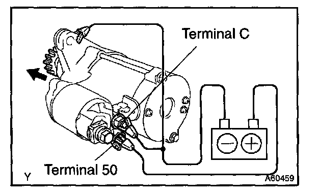 c. With battery connected as above with the clutch pinion gear out, disconnect the negative (-) lead from terminal C. Check that the pinion gear remains out.