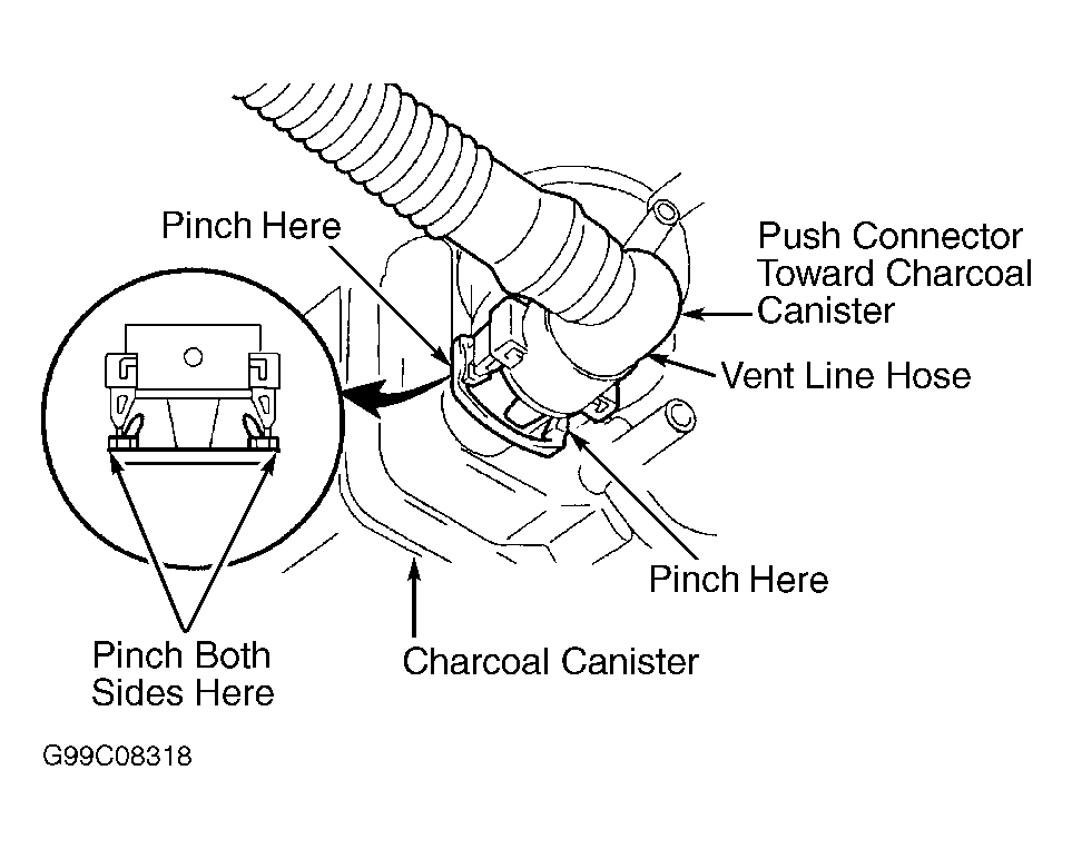 - Push connector on vent line hose toward charcoal canister and pinch both sides of retainer on connector, and then disconnect vent line hose with connector from charcoal canister. See Fig 3.