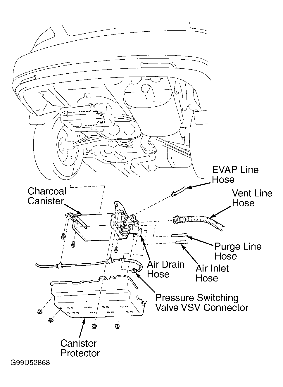 - Disconnect necessary electrical connectors and components for removal of charcoal canister. Disconnect purge line hose, EVAP line hose and air inlet line hose from charcoal canister.