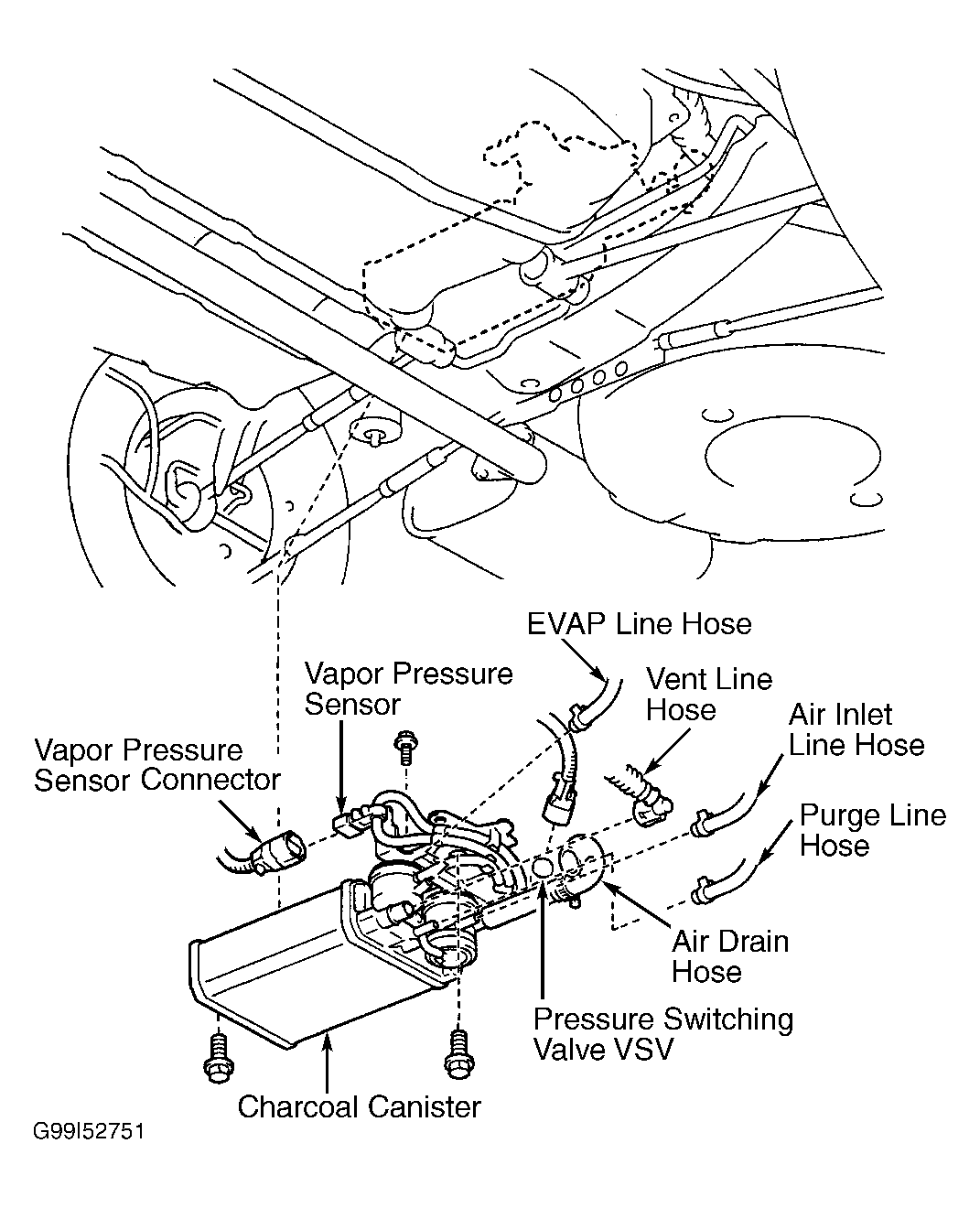 - Reinstall charcoal canister. If fuel EVAP system operates properly, it may be necessary to check operation of EVAP Vacuum Switching Valve (VSV), vapor pressure sensor, pressure switching valve and canister closed valve VSV. See EVAP VACUUM SWITCHING VALVE , VAPOR PRESSURE SENSOR CIRCUIT , PRESSURE SWITCHING VALVE VACUUM SWITCHING VALVE and CANISTER CLOSED VALVE VACUUM SWITCHING VALVE .