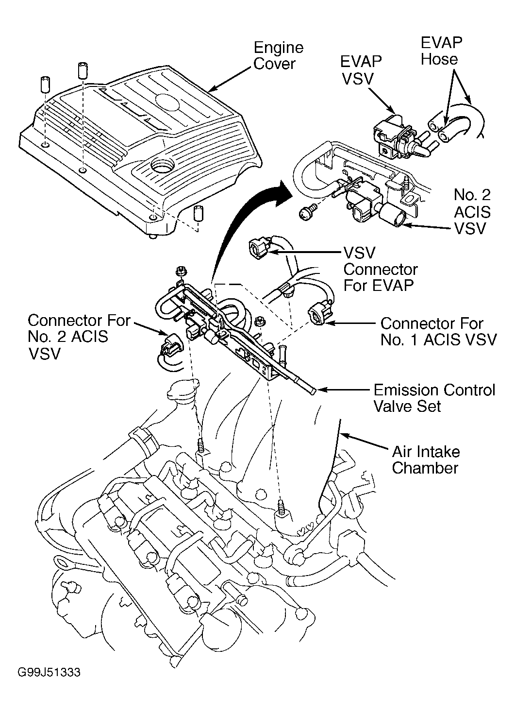- Disconnect EVAP VSV connector. EVAP VSV is mounted on air intake chamber and contains a Blue 2-pin electrical connector. See Figure. Using jumper wires, connect battery voltage and ground to EVAP VSV terminals. Start engine. Go to next step.