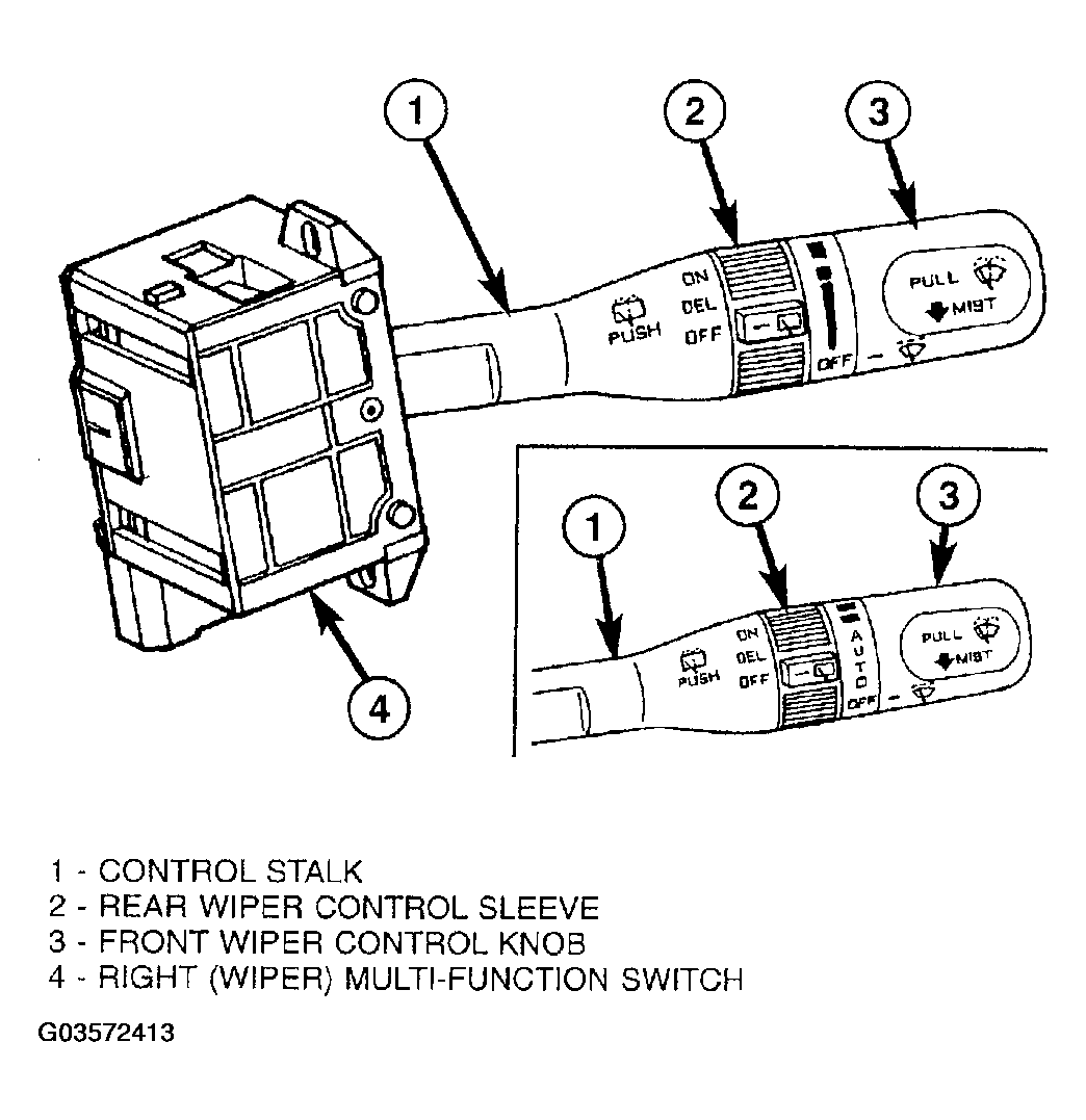 - Rear Washer Mode - The internal circuitry and hardware of the right (wiper) multi-function switch control stalk provide rear washer system operation.