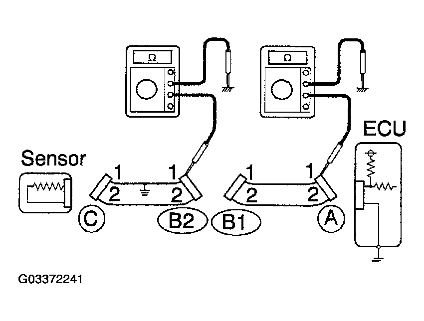 Therefore, it is found out that there is an open circuit between terminal 1 of connector "B2" and terminal 1 of connector "C".