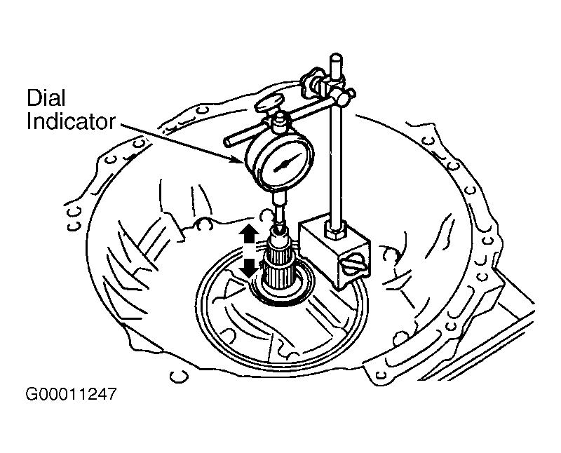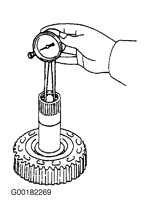 - Using a dial indicator, measure inside diameter of overdrive direct clutch hub bushing. See Fig 17. Standard diameter should be .9065-.9073" (23.025-23.046 mm). Maximum diameter is .9091" (23.090 mm). If diameter exceeds maximum specification, replace overdrive direct clutch hub. Check bushing contact surface in clutch hub shaft for scratches or discoloration. Replace as necessary.