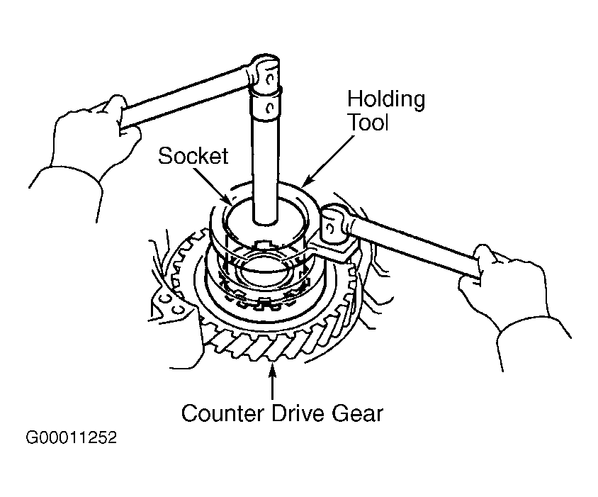- Remove 1st and reverse brake flange, 6 discs and 6 plates from transaxle case. Note location of components during removal for reassembly reference. Using a hammer and chisel, unstake washer located on counter drive gear. See Fig 14. Ensure all claws on washer are pushed down to allow socket to fit securely on nut. Using holding tool, socket and torque wrench with a fulcrum length of 6.30" (160.0 mm), remove nut. See Fig 23.