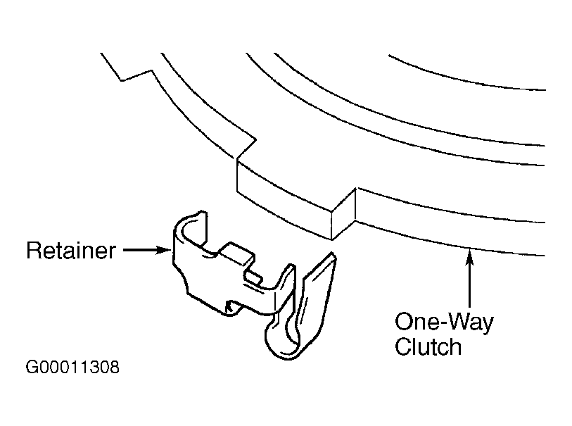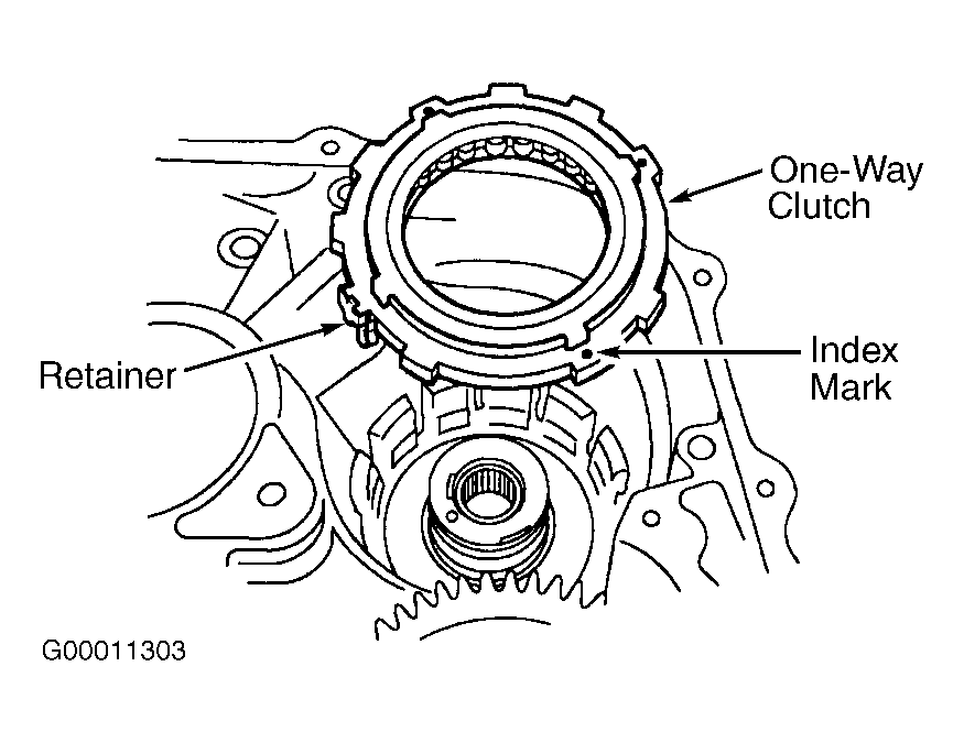 - Remove torsion spring, pawl pin and parking lock pawl. Remove underdrive clutch assembly, needle roller bearing and thrust bearing race from transaxle case. See Fig 15. Using a screwdriver, remove underdrive one-way clutch snap ring. Remove one-way clutch from transaxle case. Note position of index marks on one-way clutch for reassembly reference. See Figure. Note position of outer race retainer on one-way clutch for reassembly reference. See Fig 19. Remove outer race retainer from one-way clutch.