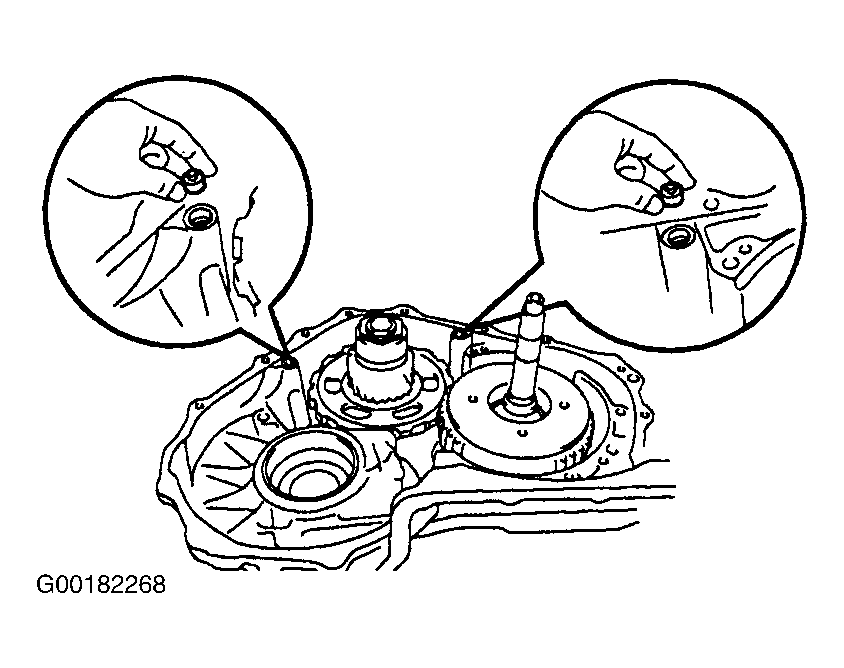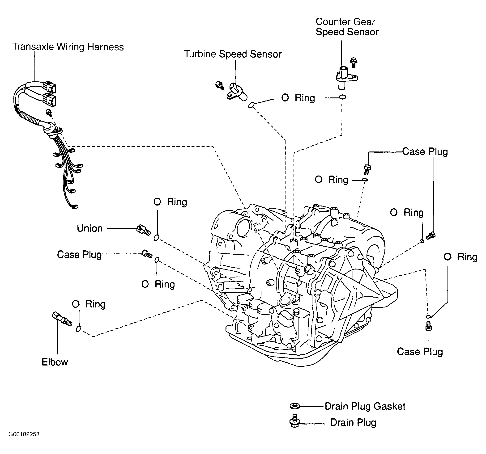 - Remove oil line union and elbow. Remove and discard "O" rings from union and elbow. Remove counter gear and turbine speed sensors from top of transaxle. Remove and discard speed sensor "O" rings. Remove transaxle case plugs from transaxle case. Remove and discard case plug "O" rings. See Fig 1.