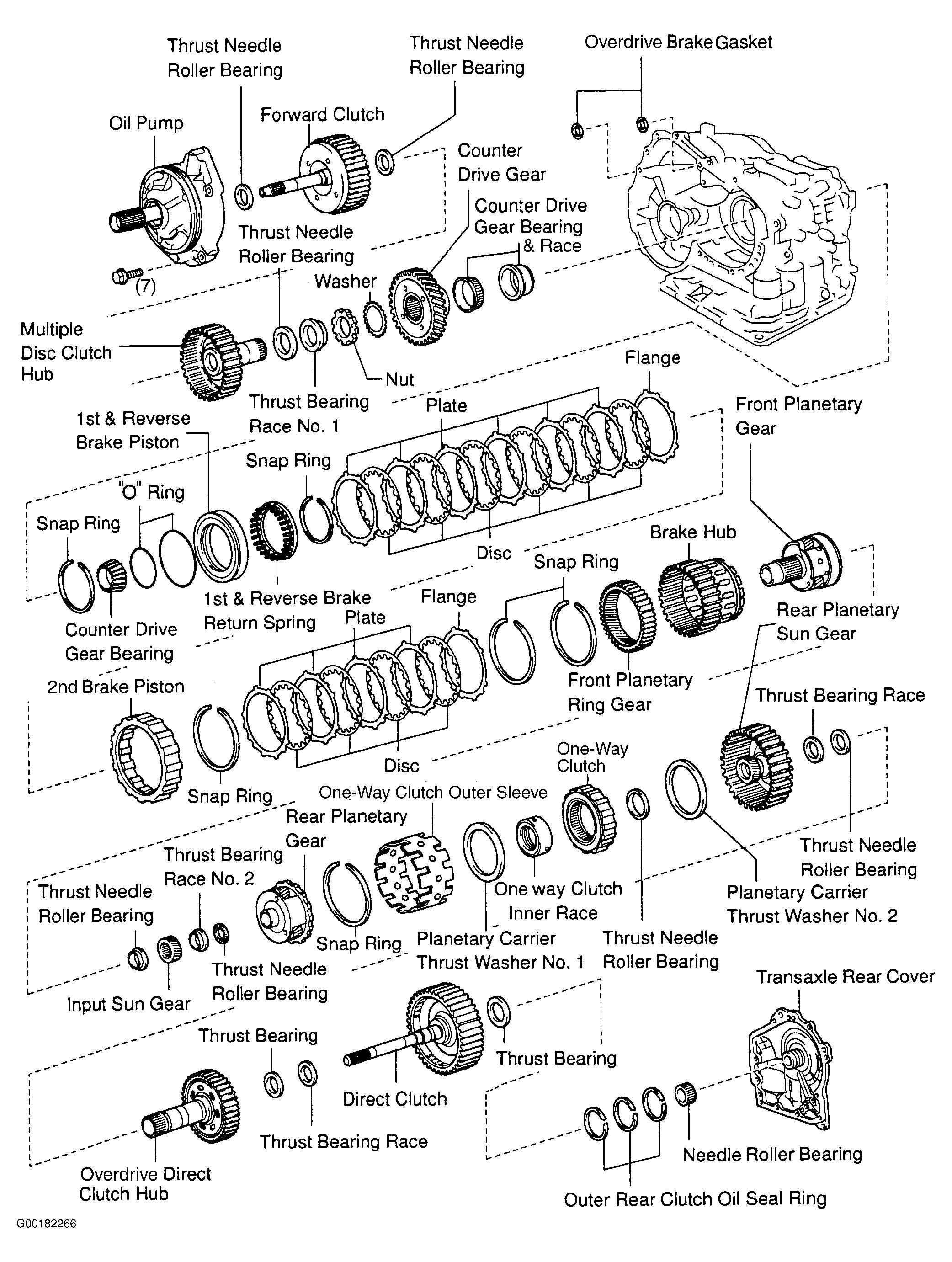 - Remove 7 oil pump bolts and oil pump from transaxle case. Remove thrust needle roller bearing from underdrive planetary gear. Remove thrust bearing underdrive race No. 2 from underdrive planetary gear. Remove differential assembly. See Fig 15. Remove 2 overdrive brake gaskets from transaxle case. See Fig 16. Remove forward clutch from transaxle case. Remove thrust needle roller bearing from forward clutch. Remove thrust needle roller bearing, multiple disc clutch hub, thrust needle roller bearing and bearing race No. 1 from transaxle case. See Fig 14.