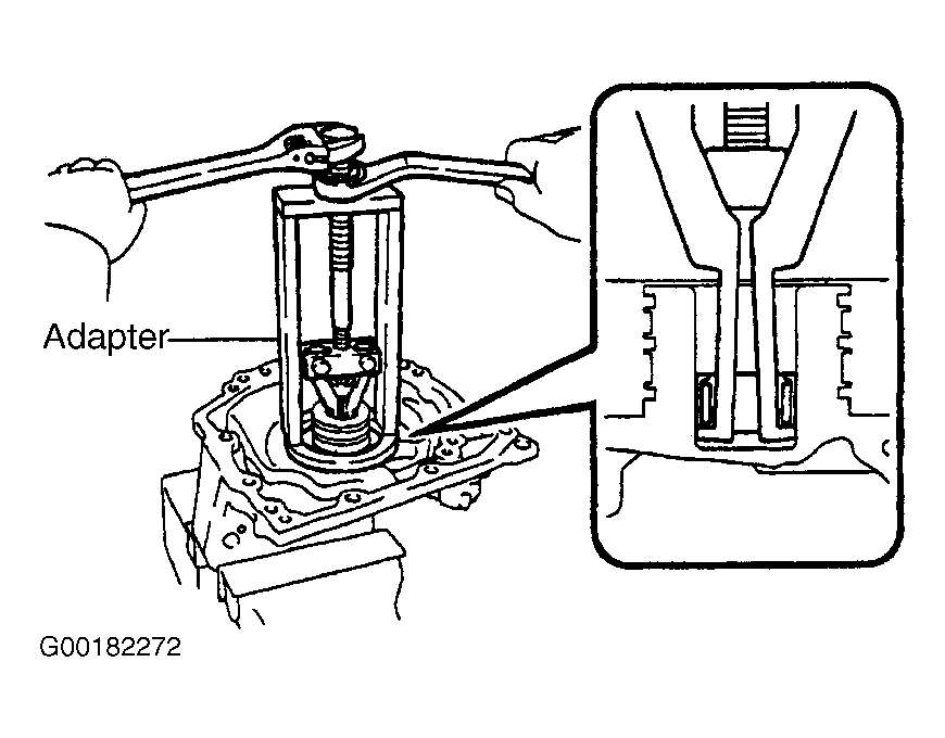 - Remove 11 bolts and transaxle rear cover. If necessary, tap on circumference of rear cover with plastic hammer to remove cover. Remove 4 transaxle case plugs from transaxle rear cover. Remove "O" rings. See Fig 20. Remove 3 oil seal rings from transaxle rear cover. Using appropriate puller, remove needle roller bearing from transaxle rear cover, if necessary. See Fig 21. Using a screwdriver, remove 3 governor apply gaskets from rear of transaxle case. See Fig 15.