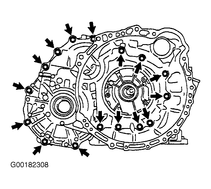 - Using a dial indicator, measure input shaft end play and record measurement. See Fig 12. End play should be .0103-.0492" (.262-1.249 mm). Remove 16 transaxle housing bolts. Note bolt length and location during removal for reassembly reference. See Fig 13.