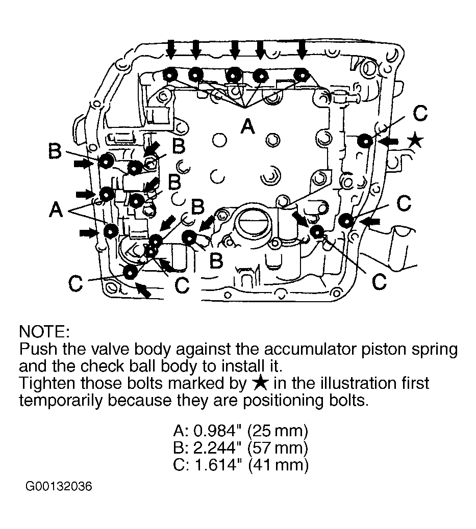 - Install the 17 bolts. Push the valve body against the accumulator piston spring and the check ball body to install it. See Fig 3. Tighten bolts to specification. See TORQUE SPECIFICATIONS .