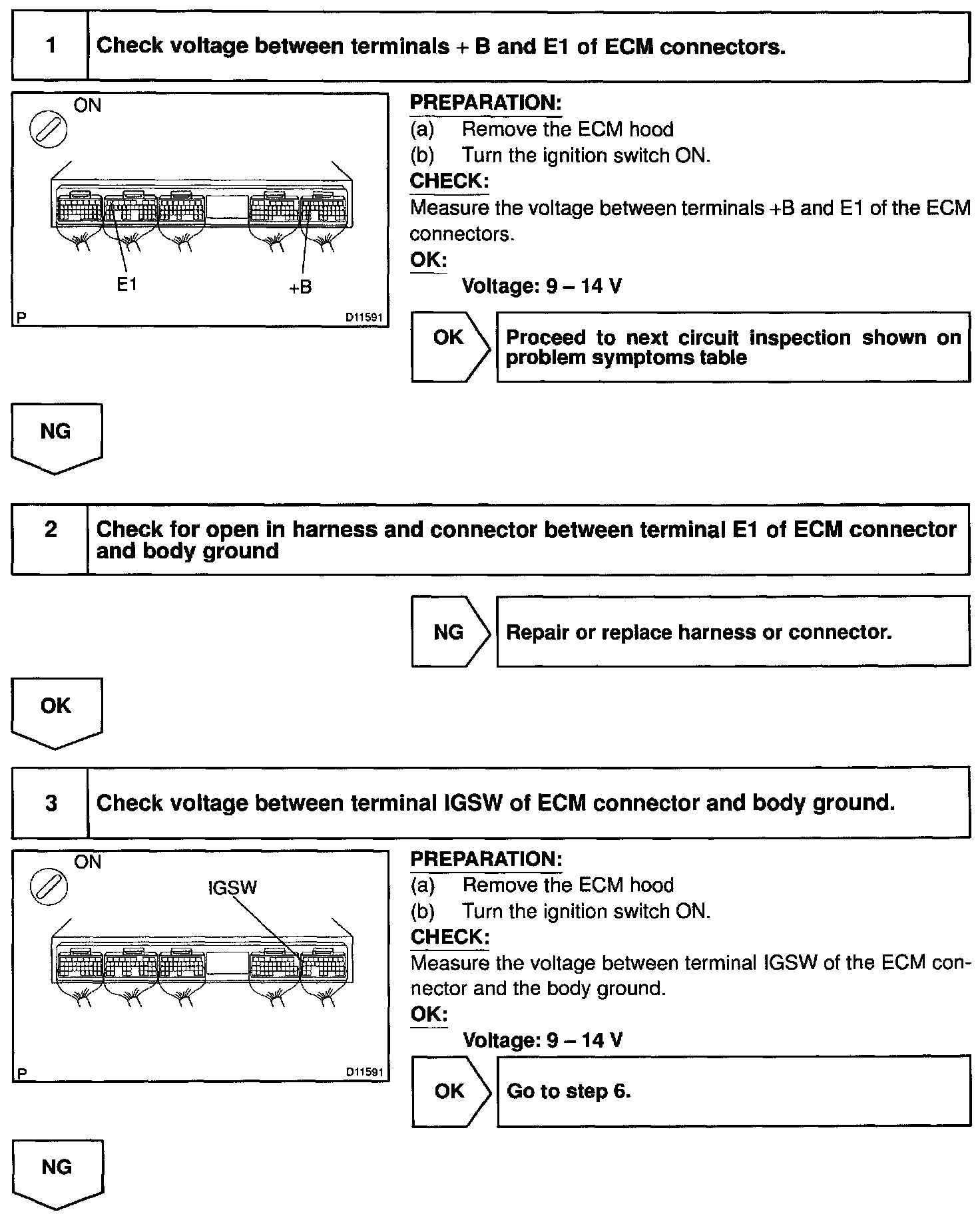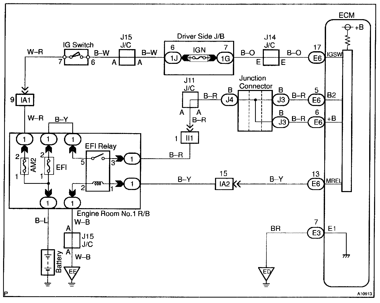 This signal causes current to flow to the coil, closing the contacts of the EFI main relay and supplying power to terminals +B and B2 of the ECM.