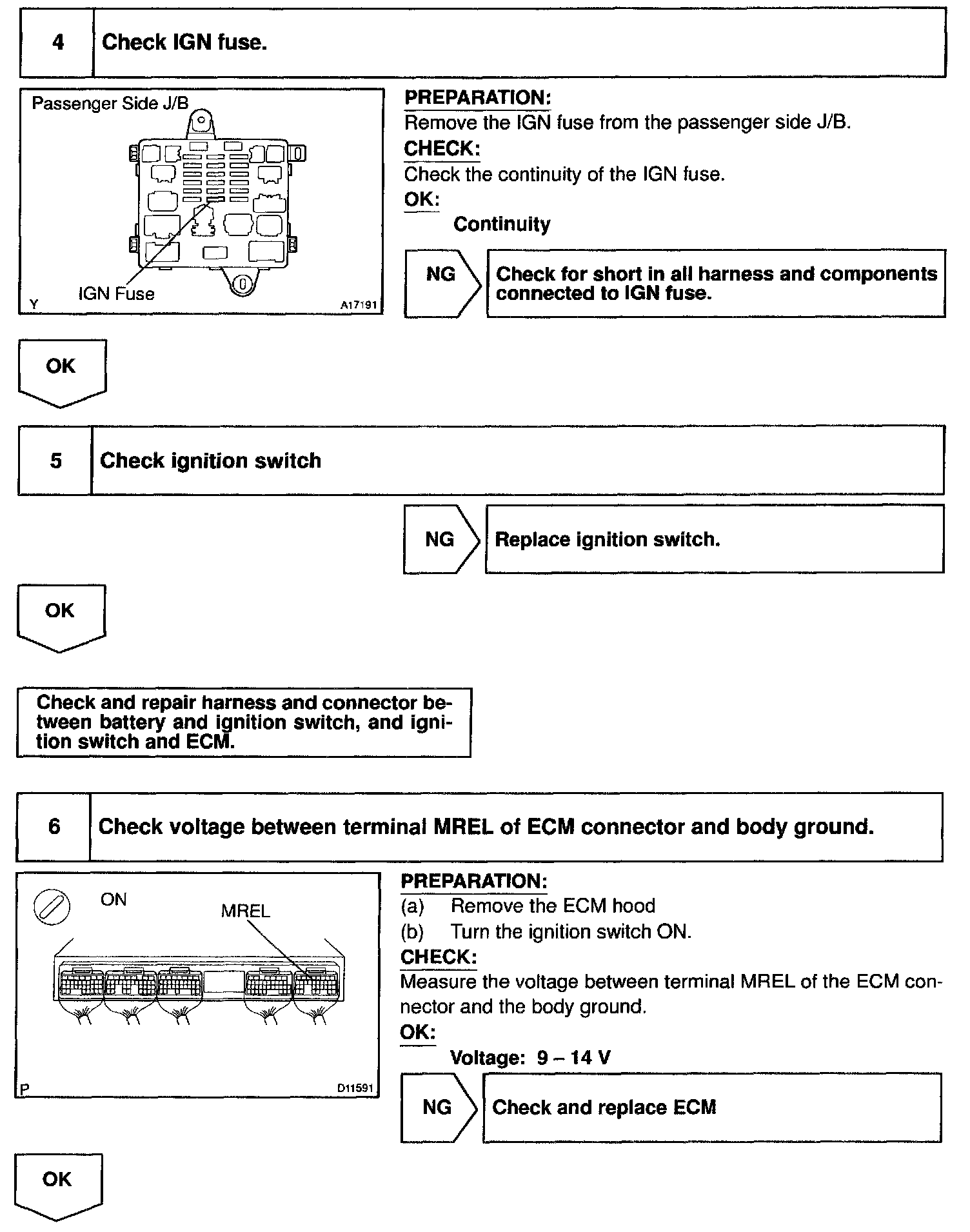 When the ignition switch is turned ON, battery positive voltage is applied to terminal IGSW of the ECM and the EFI main relay (Marking: EFI) control circuit in the ECM sends a signal to terminal MREL of the ECM, switching on the EFI main relay.