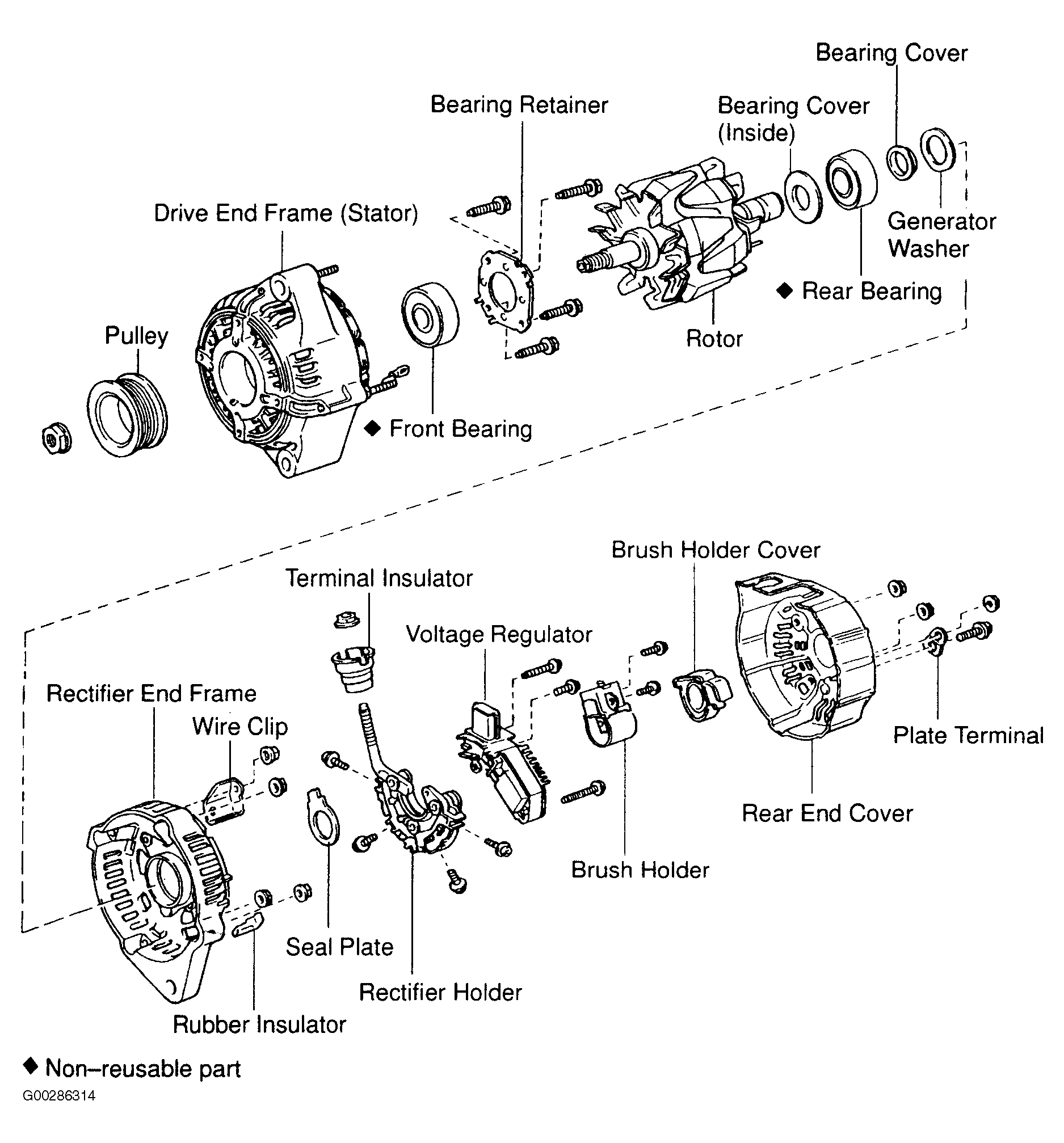 1. Remove nut and terminal insulator. Remove plate terminal and rear end cover. See Fig 1. Remove brush holder and voltage regulator. Remove diode (rectifier) holder. Remove rubber insulators. Use generator Pulley Set Nut Wrench Set (SST 09820-63010) to remove generator pulley.