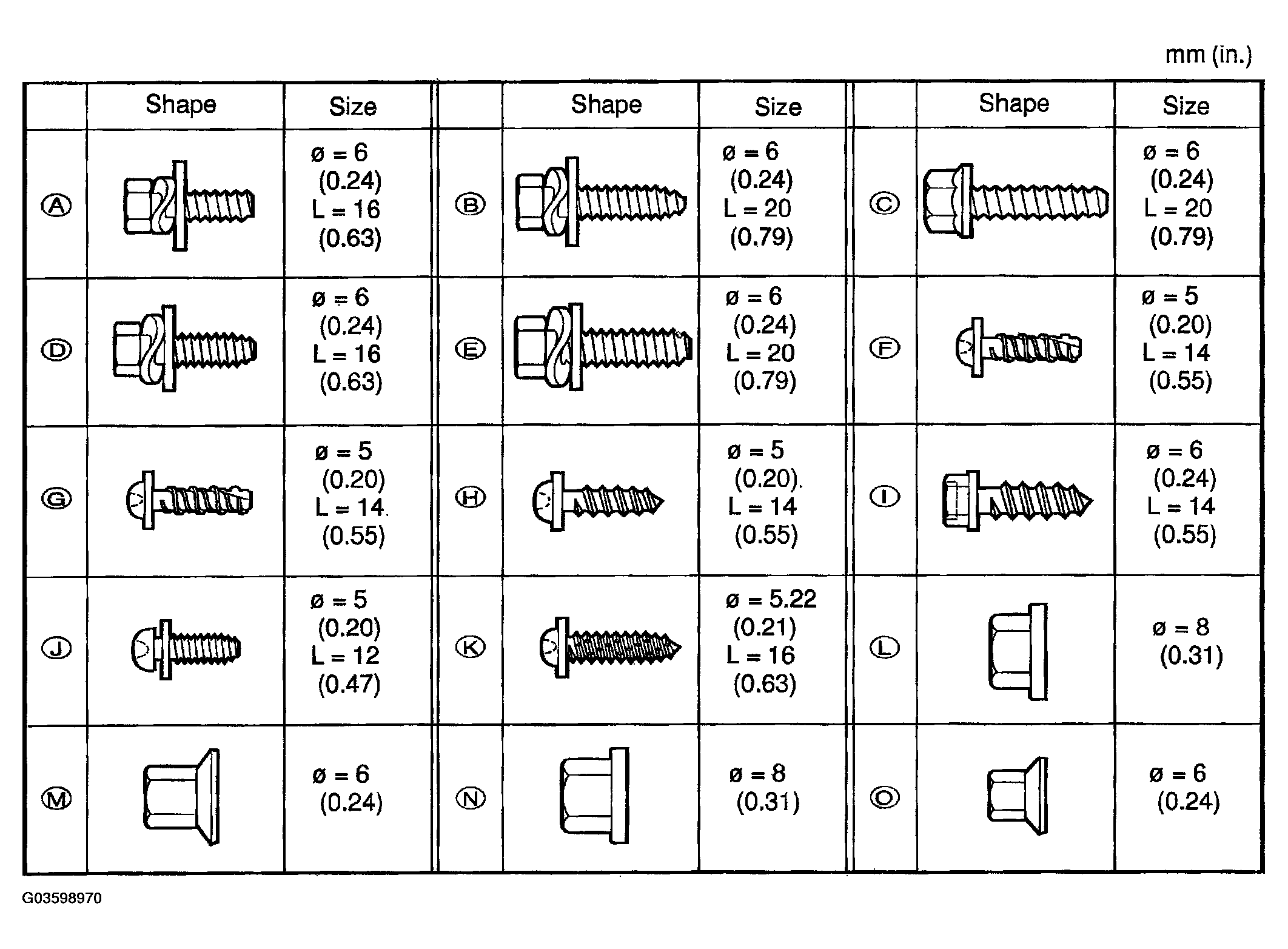 Screw shapes and size are indicated in Fig 3 . The codes ("A" - "O") correspond to those indicated on the previous pages.